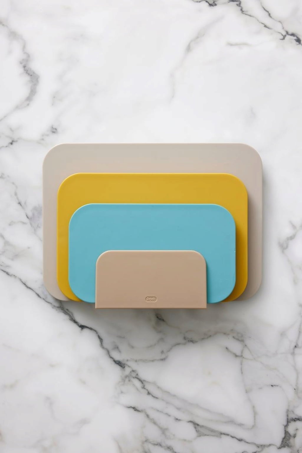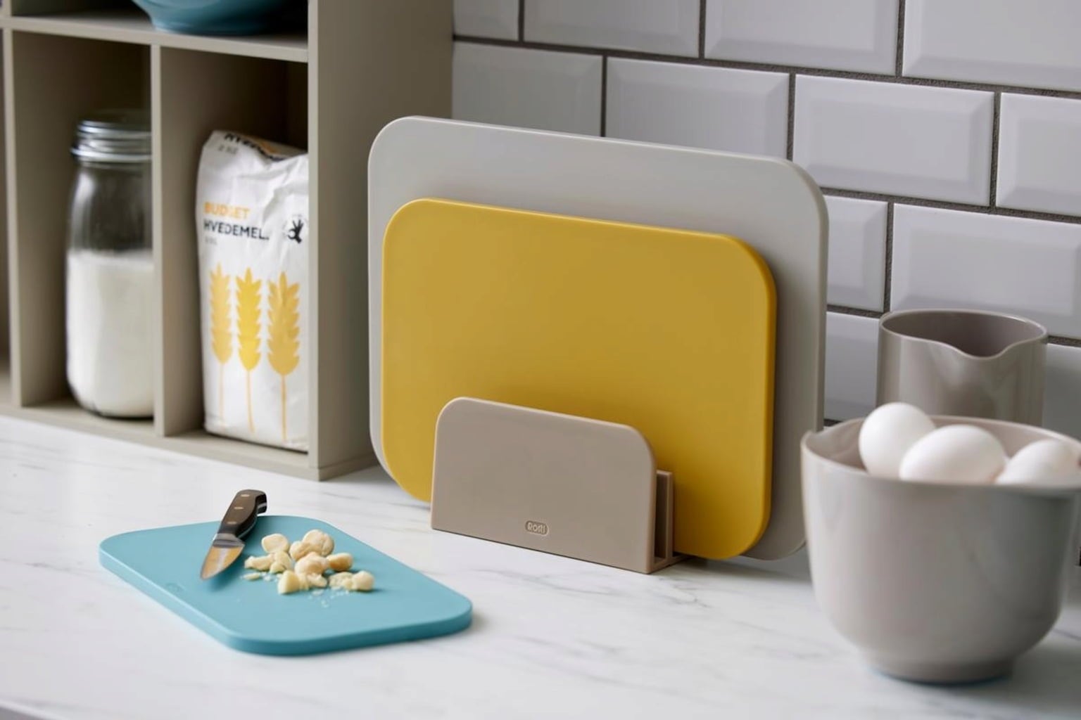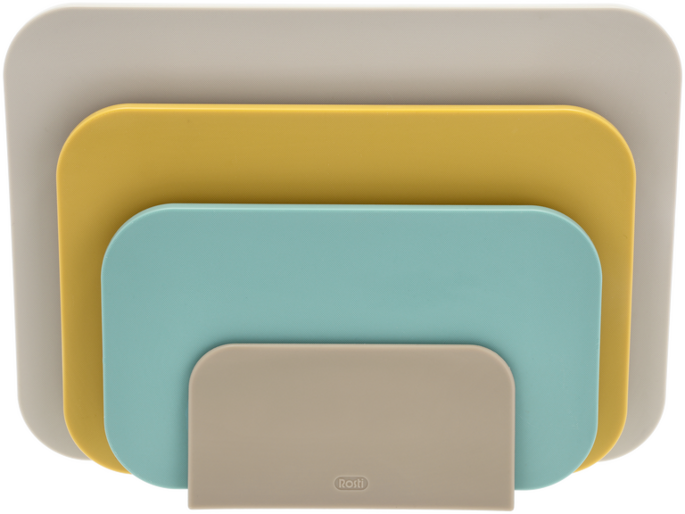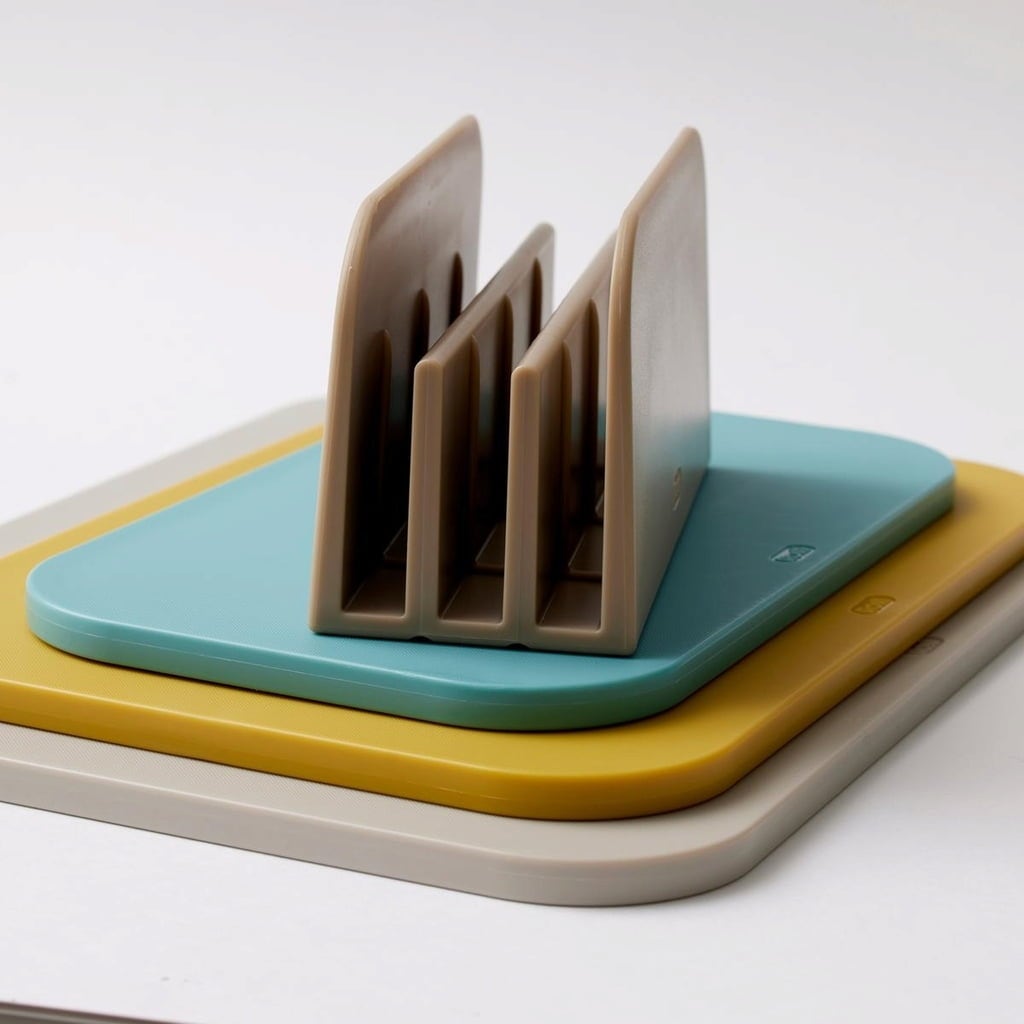 The set includes a practical holder that is not only a space-saving way to store the chopping boards, it also ensures better hygiene. The chopping boards are held a distance from each other when placed in the holder ensuring that they are well ventilated after use. Grooves on the underside ensure optimum air circulation, even if a board is still damp.