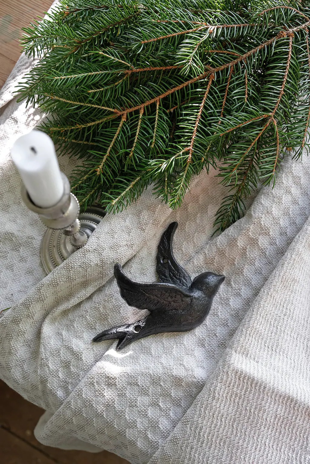 This little cast iron bird holds one of its wings just right so that you can hang wreaths, jackets, or bags on it. The charming accessory only reveals its practical use at a second glance.
