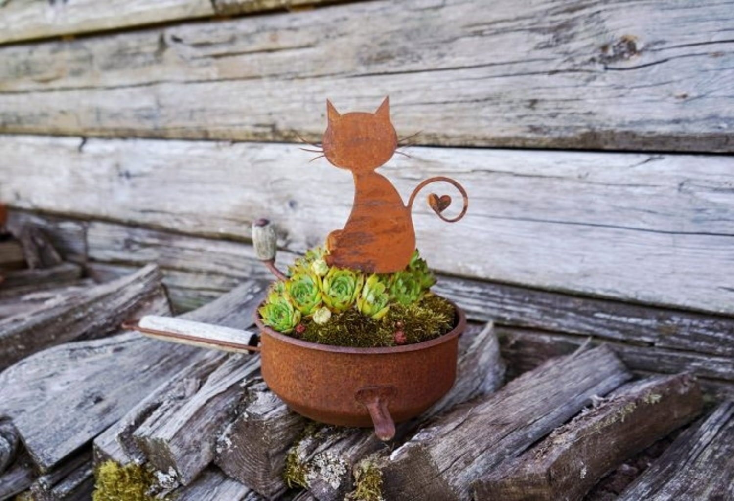 Cette magnifique décoration "chat" s'intégrera parfaitement dans un parterre de fleurs ou un pot. La patine rouille donne une touche moderne et chic à votre jardin !