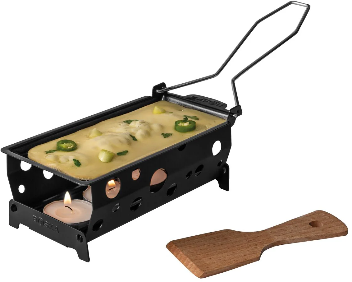 Déguster du fromage fondu où vous voulez et quand vous voulez ? C'est possible grâce à cet ensemble raclette. Il suffit d’allumer les bougies chauffe-plat, de poser la Barbeclette dessus, d’ajouter le fromage à raclette et quatre minutes plus tard, de déguster une délicieuse raclette. Et cela, où que vous soyez, car grâce à ses dimensions compactes, cet ensemble peut être transporté facilement. Il est rapide à installer et se nettoie tout aussi rapidement après utilisation. Des matériaux de haute qualité et une fabrication solide lui assurent une longue durée de vie.