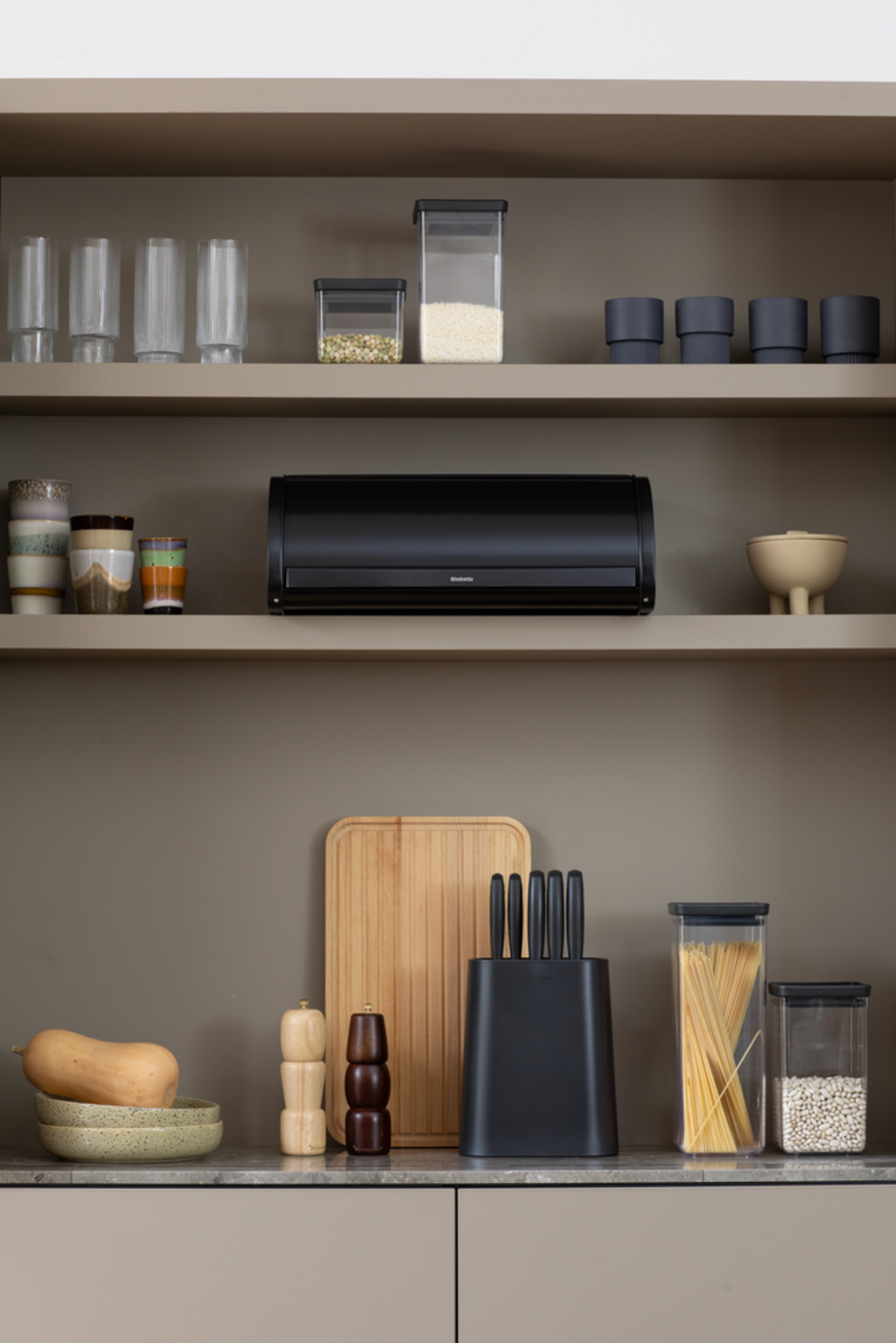 Pain blanc, pain complet ou croissants : cette élégante boîte peut contenir jusqu’à deux pains et les garde frais plus longtemps grâce à son fond rainuré pour une meilleure circulation de l'air. Son couvercle coulisse silencieusement à l'intérieur de la boîte, libérant de la place sur le plan de travail. Vous pouvez poser ce que vous souhaitez sur son dessus en partie plat !