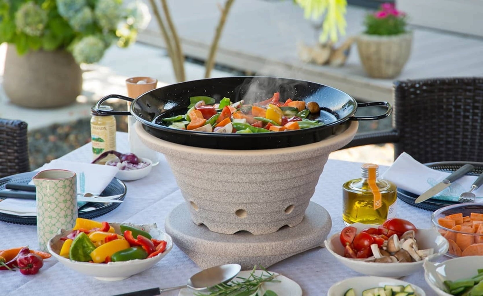 Contenu : Bratfeuer, support, bol CeraFlam® avec revêtement Granicium®, poêle en acier émaillé, couvercle en aluminium, grille à cendres en inox, 2 briquettes rapides