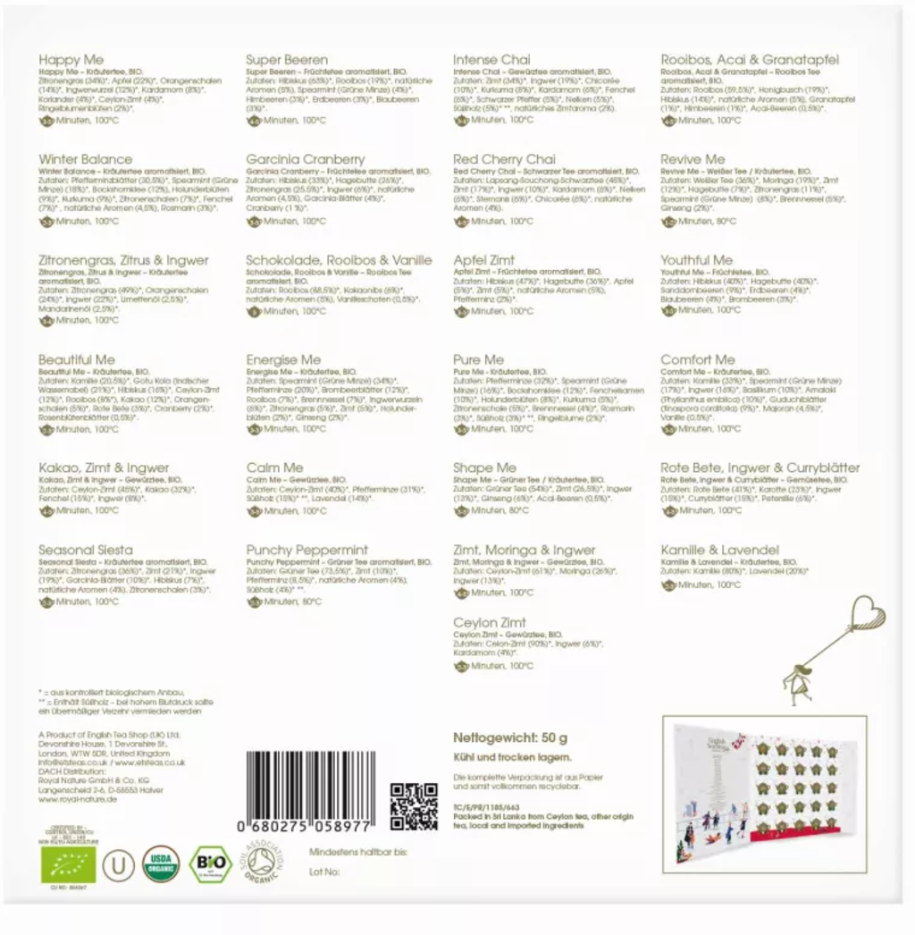 La période qui précède Noël est souvent synonyme de stress. Pour cette raison, les moments de détente sont essentiels pour pouvoir se ressourcer et retrouver la paix intérieure. Ce calendrier de l'Avent saura vous accompagner de manière optimale, car derrière chacune de ses fenêtres se cache une délicieuse tisane de qualité bio. Ainsi, vous pourrez profiter chaque jour d'un moment de bien-être et de détente incomparable.