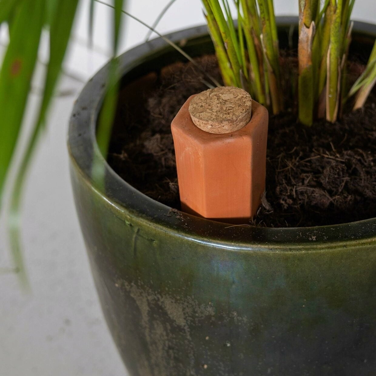 Il suffit de planter le cône dans la terre, d'y verser de l'eau et de le refermer avec le bouchon. Vérifier de temps en temps s'il faut à nouveau le remplir en eau.