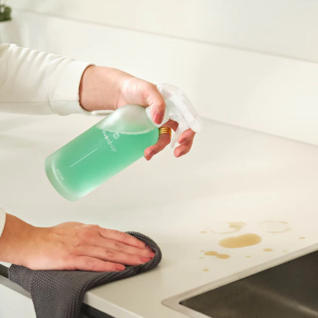 La bouteille en verre réutilisable est le complément idéal du nettoyant cuisine en poudre. L'inscription "Küche" sur la bouteille signifie "cuisine" en allemand.