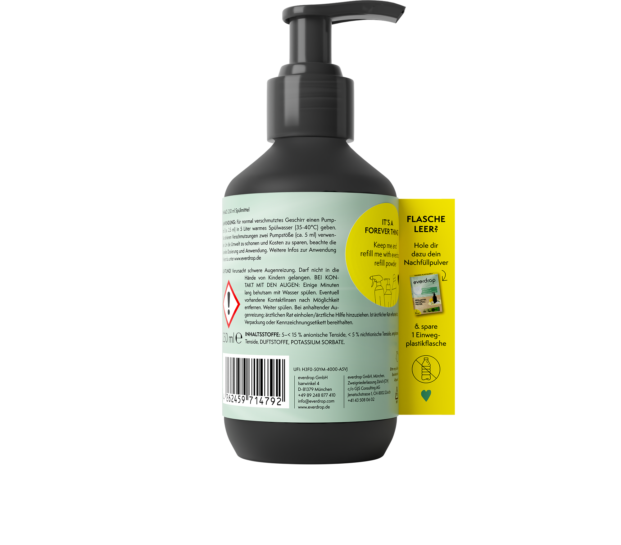 Le flacon-pompe pratique est rechargeable, donc lorsque votre liquide vaisselle est épuisé, vous pouvez facilement mélanger de l'eau avec la Liquide Vaisselle en Poudre - Sachet innovante d'everdrop pour obtenir un nouveau liquide vaisselle !