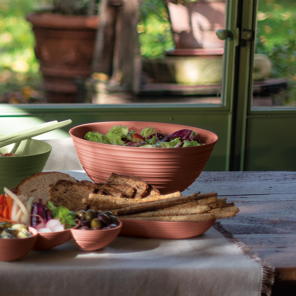 "TIERRA" de Guzzini : Toutes les pièces de cette série unique ressemblent à de la vaisselle faite à la main dans leur design volontairement irrégulier, mais sont fabriquées à partir de bouteilles à usage unique 100 % recyclées - écologiques, durables et indéniablement chic italien.