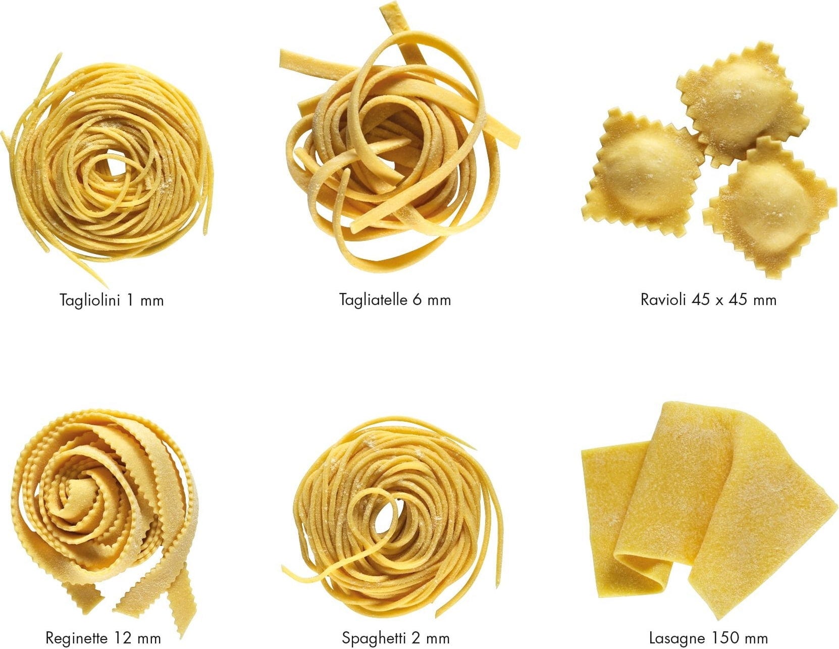- Pour 6 types de pâtes : lasagne, tagliolini, tagliatelle, spaghetti, reginette et ravioli