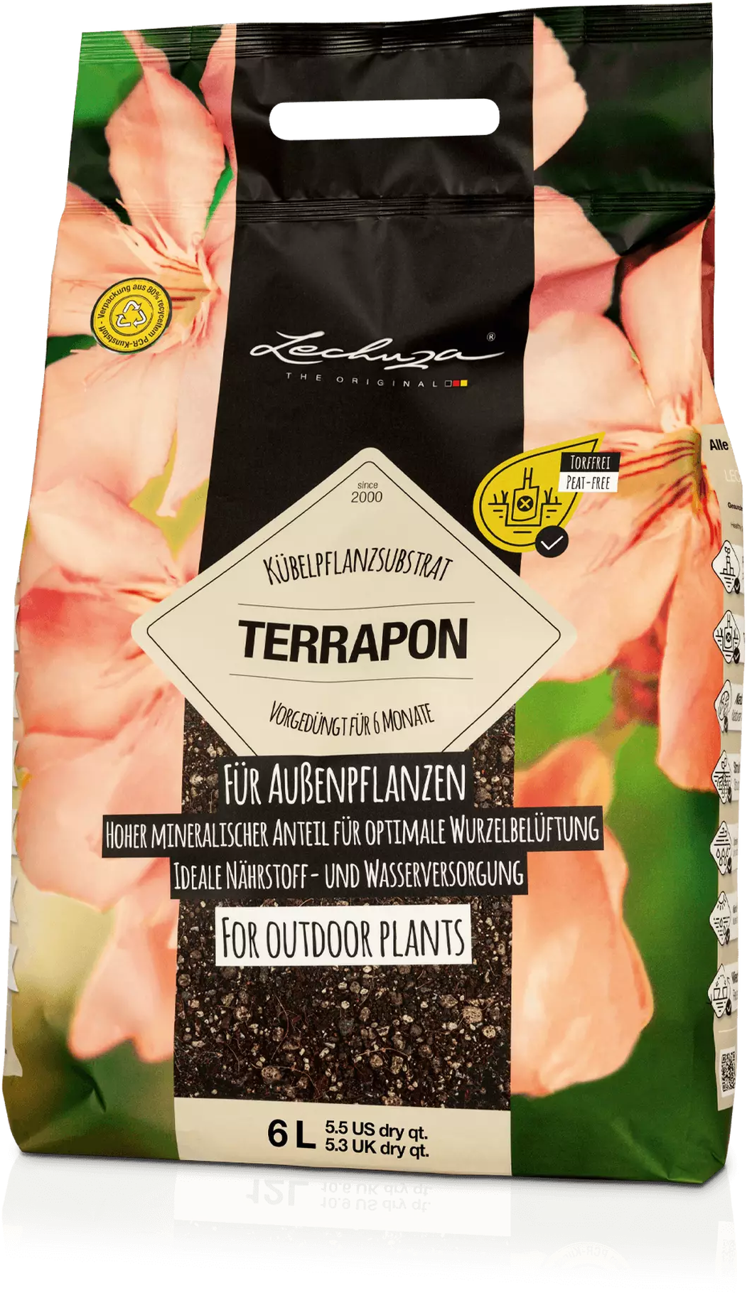 TERRAPON favorise une pousse saine et luxuriante de vos plantes, grâce à sa composition finement ajustée. Le substrat assure un rapport air-eau optimal, et contient également un mélange actif d'engrais, de sorte qu'il approvisionne continuellement la plante en pot en nutriments, pendant une période de 6 à 8 mois.