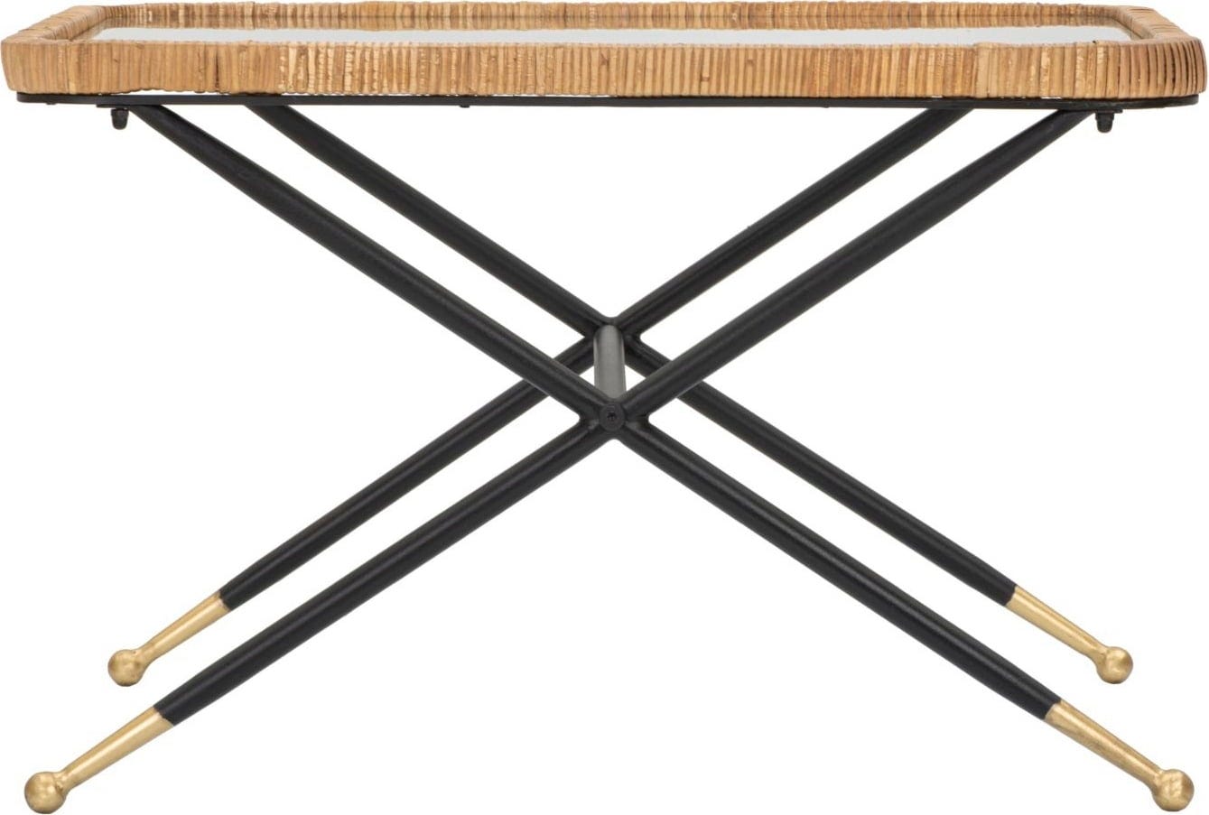 Offrez à votre salon une touche de design simple mais esthétique avec cette table basse rectangulaire ! Elle allie la transparence épurée d'un plateau en verre rectangulaire à la texture chaleureuse et naturelle d'un tressage en rotin qui encadre élégamment le plateau. La structure métallique noire robuste, avec ses pieds en forme de X, assure une grande stabilité et un contraste moderne.