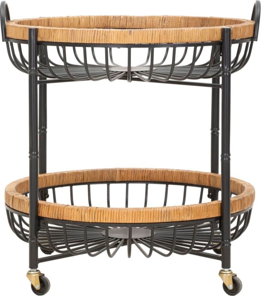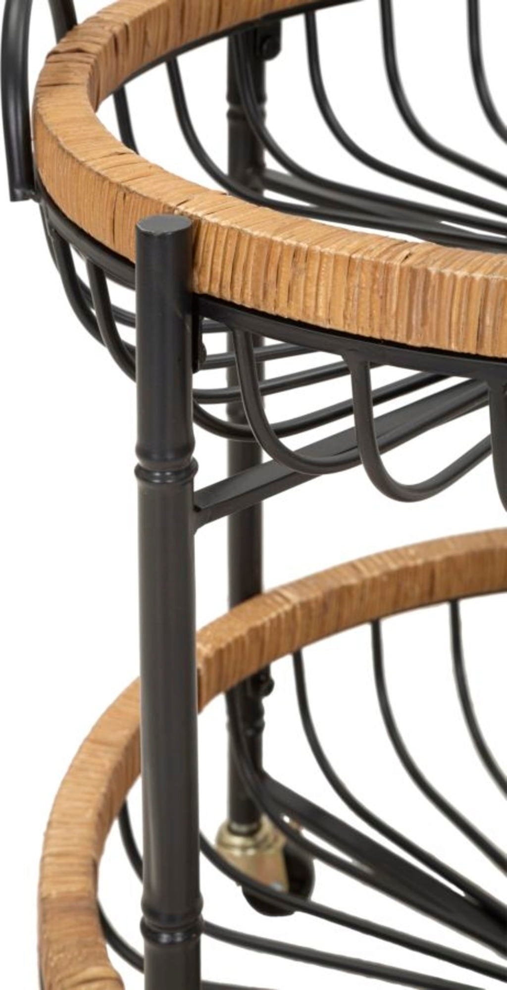 Sa structure en métal noir supporte deux grands paniers de rangement, dont les fines tiges métalliques sont soulignées par un cadre en rotin chaleureux. Grâce à ses quatre roulettes, ainsi qu’à ses poignées intégrées, Cebu se déplace facilement et s’utilise là où vous en avez besoin : chariot bar, table d’appoint ou support décoratif pour plantes.