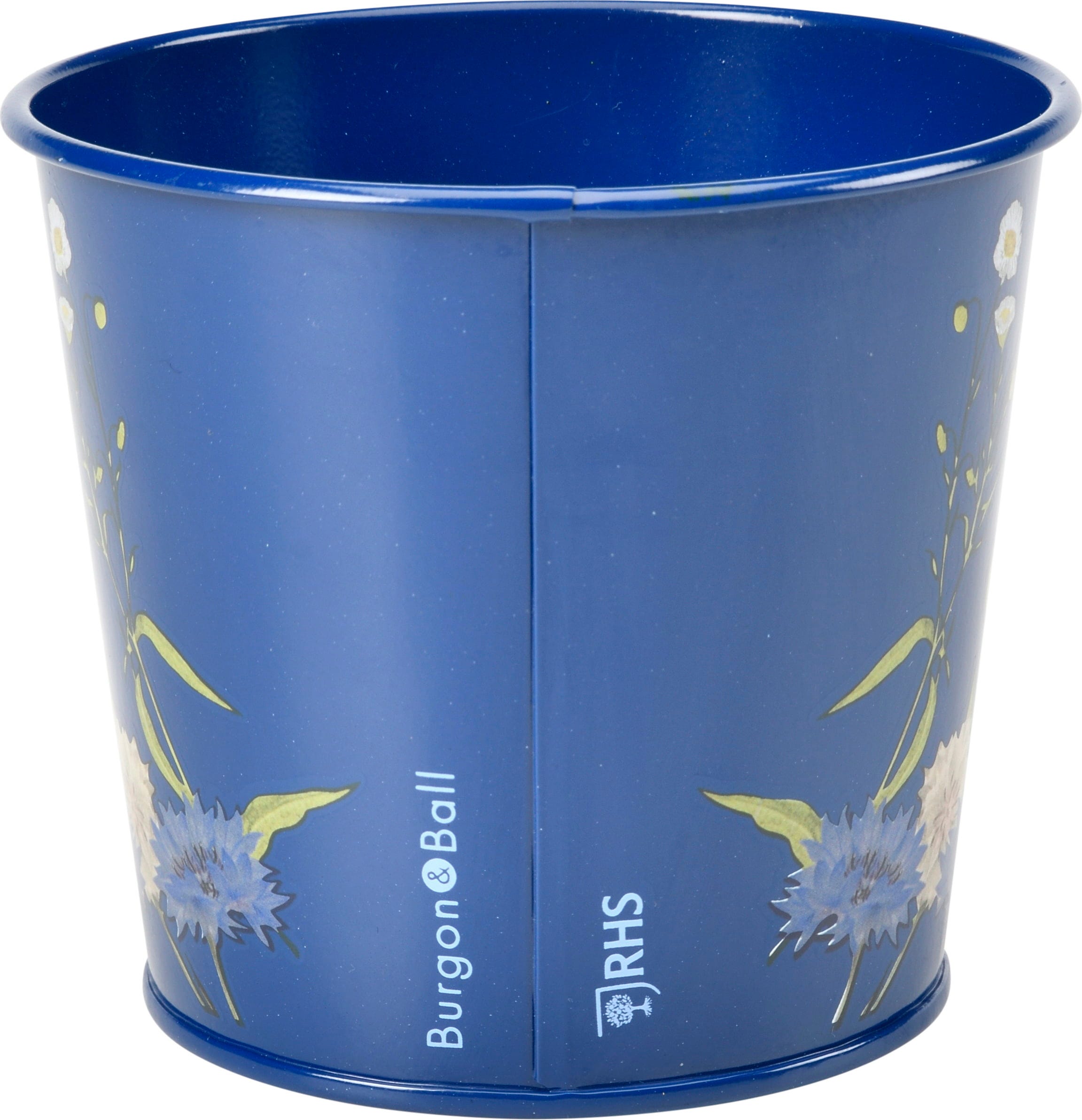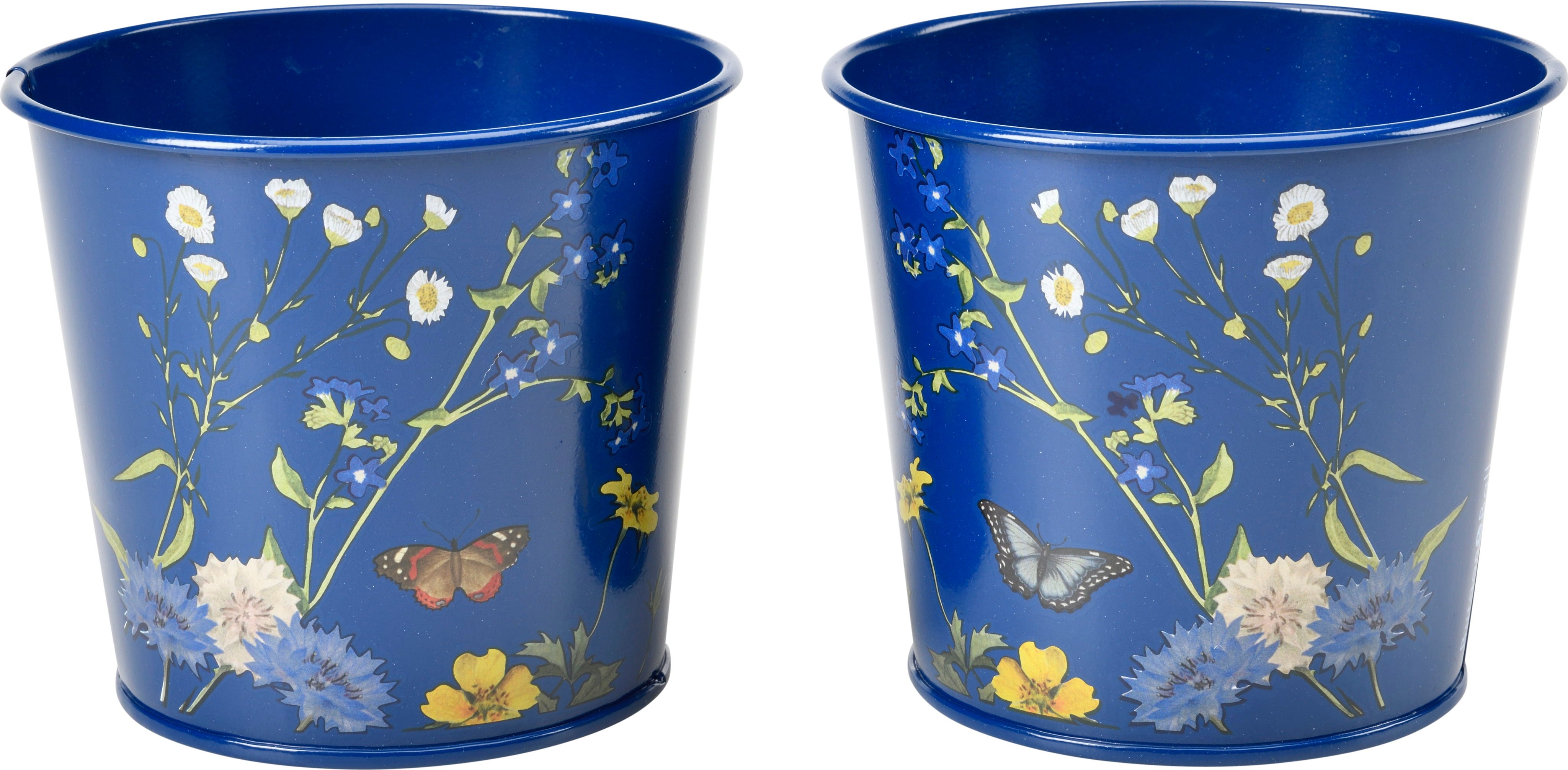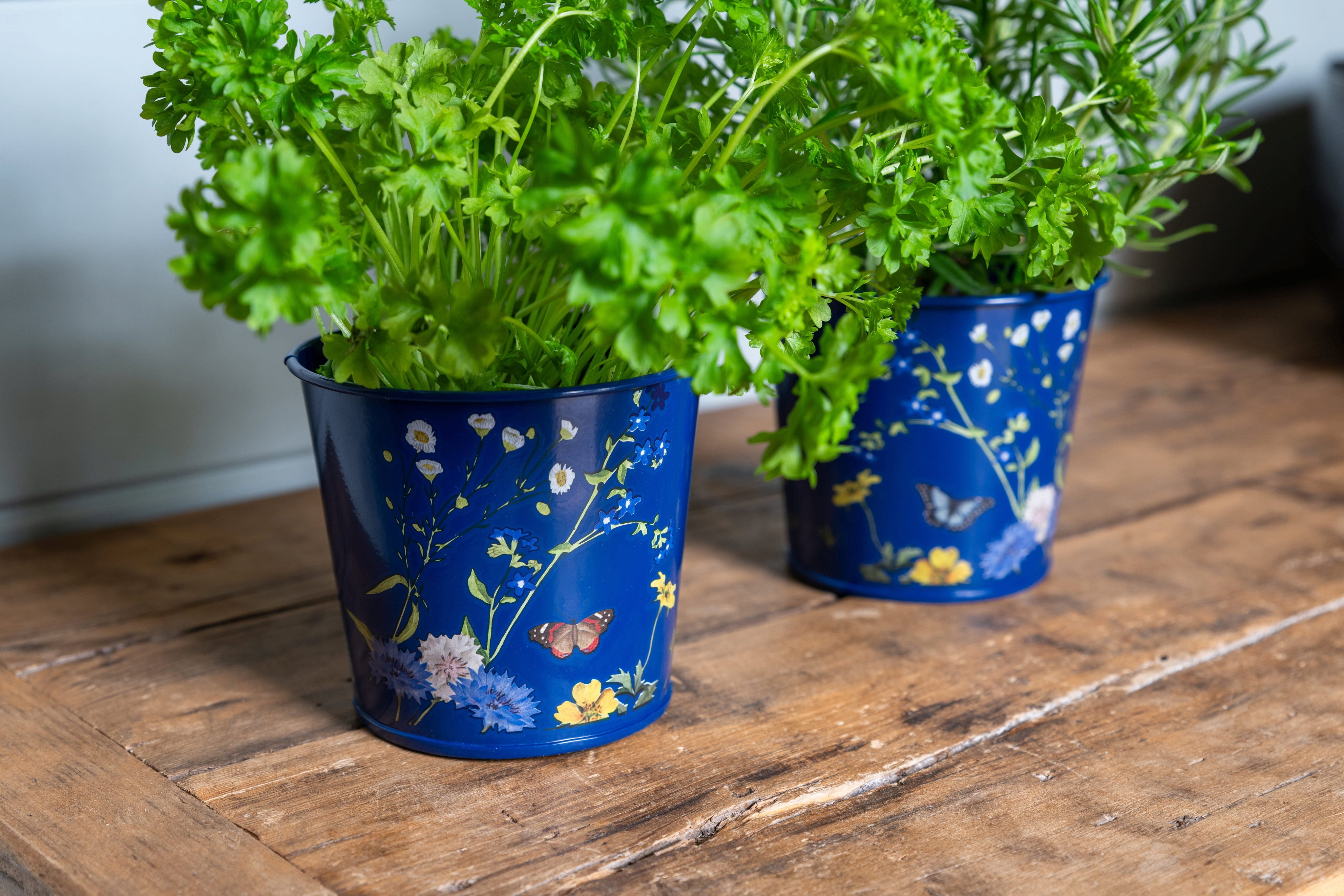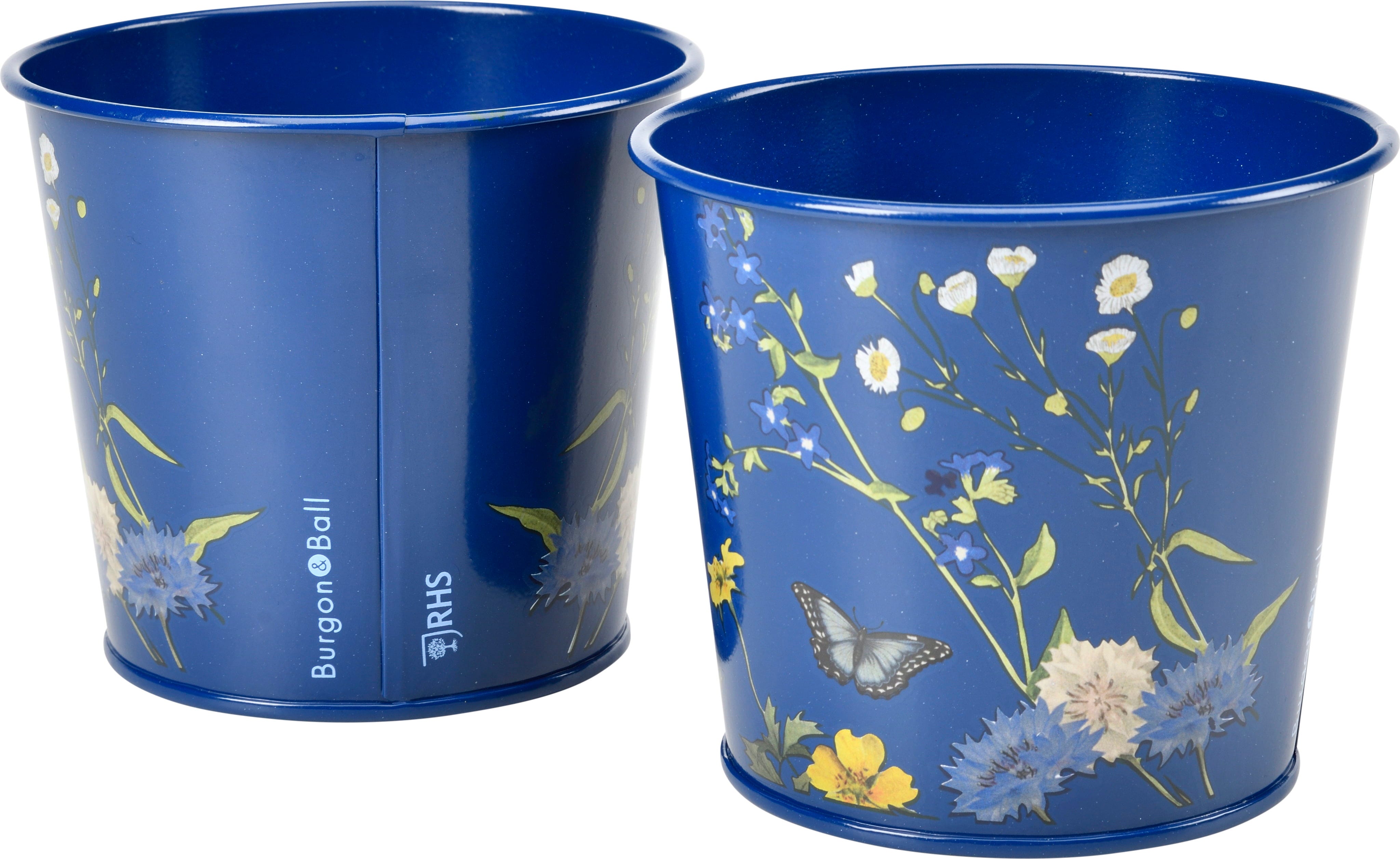 Gli eleganti vasi per erbe aromatiche di Burgon & Ball portano un tocco di natura britannica sul tuo davanzale. Realizzati in robusto acciaio con rivestimento a polvere, presentano il raffinato design British Meadow con delicate illustrazioni di fiori selvatici e farfalle su fondo blu.