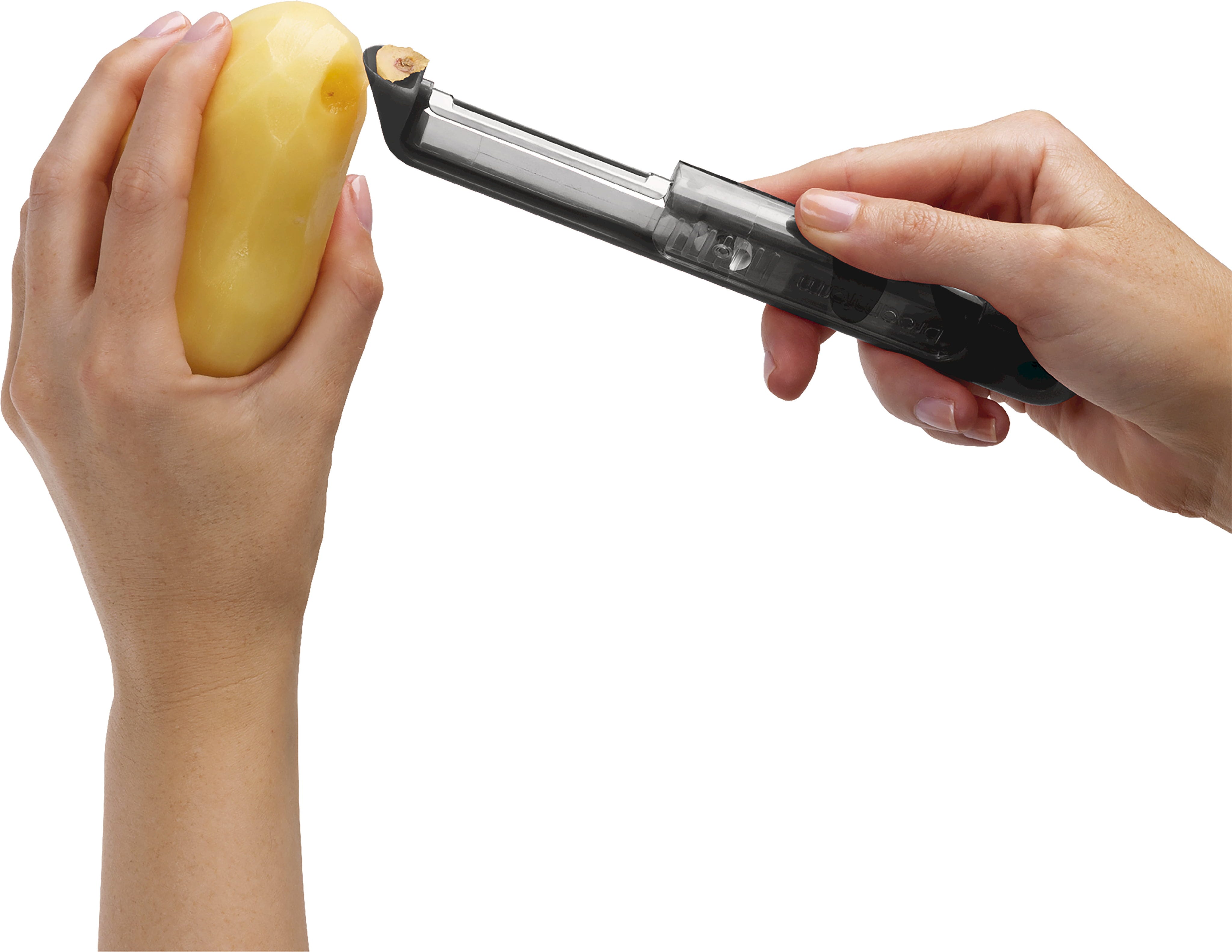 Il pelaverdure Sharple di Dreamfarm è dotato di una lama in acciaio inox giapponese estremamente affilata che, grazie al supporto oscillante, riduce al minimo gli scarti. Il vero punto di forza è l'innovativa copertura di sicurezza: ogni volta che apri o chiudi la protezione, una sfera affilatrice in ceramica integrata riaffila automaticamente la lama. In questo modo scorri senza sforzo sulle bucce di frutta e verdura a ogni utilizzo, mentre il leva-occhi integrato elimina in un attimo le parti indesiderate delle patate. Adatto sia a destrimani sia a mancini, questo utensile ergonomico sta perfettamente in mano e dopo l'uso può essere comodamente lavato in lavastoviglie.