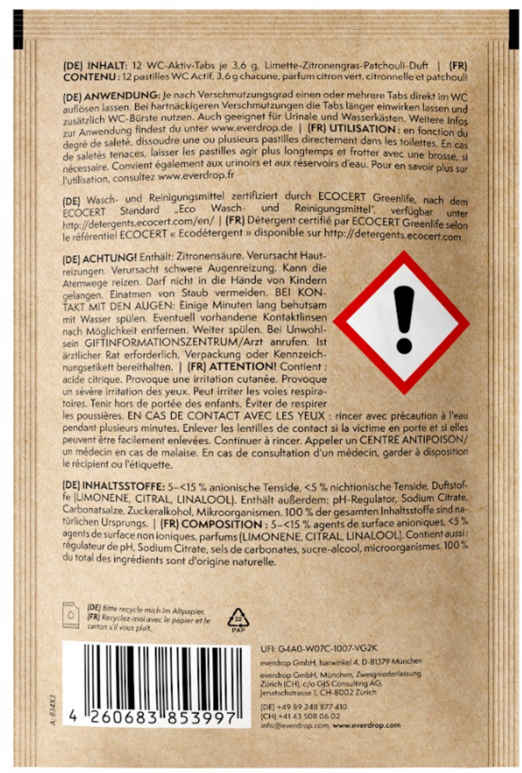 Queste pastiglie per WC di everdrop convincono grazie al loro elevato potere pulente. La speciale formula contrasta la causa degli odori sgradevoli. Gli ingredienti 100% naturali aiutano contro il calcare, le incrostazioni di urina e lo sporco ostinato.