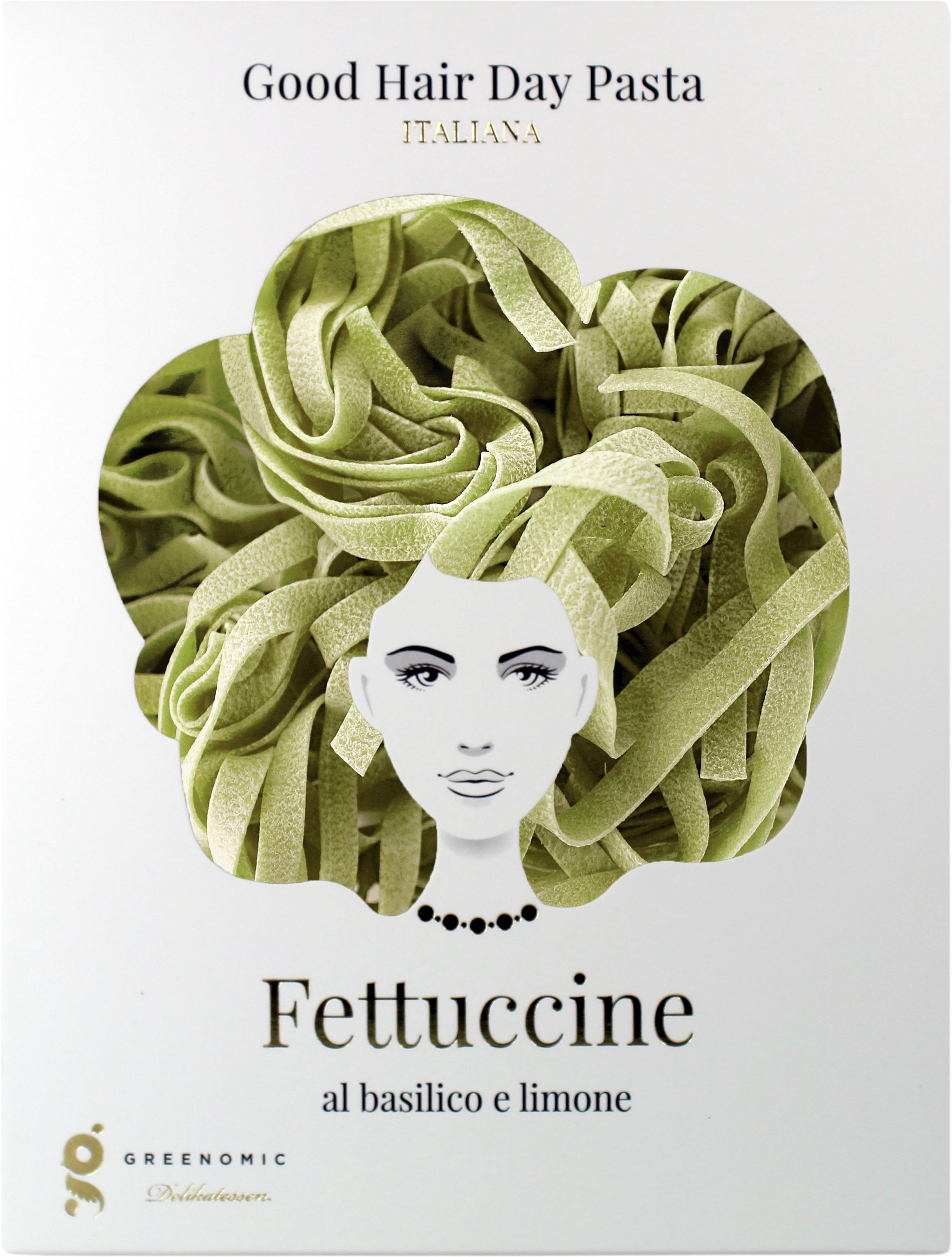 Realizzate con la migliore semola di grano duro utilizzando la tradizionale trafilatura al bronzo, le fettuccine al basilico e limone di Greenomic non sono solamente squisite, ma sono anche bellissime da vedere con il loro delicato colore verde. Anche questa creazione della linea "Good Hair Day" si distingue per l'alta qualità degli ingredienti e per l'originale confezione che la rende ideale anche come regalo gastronomico.