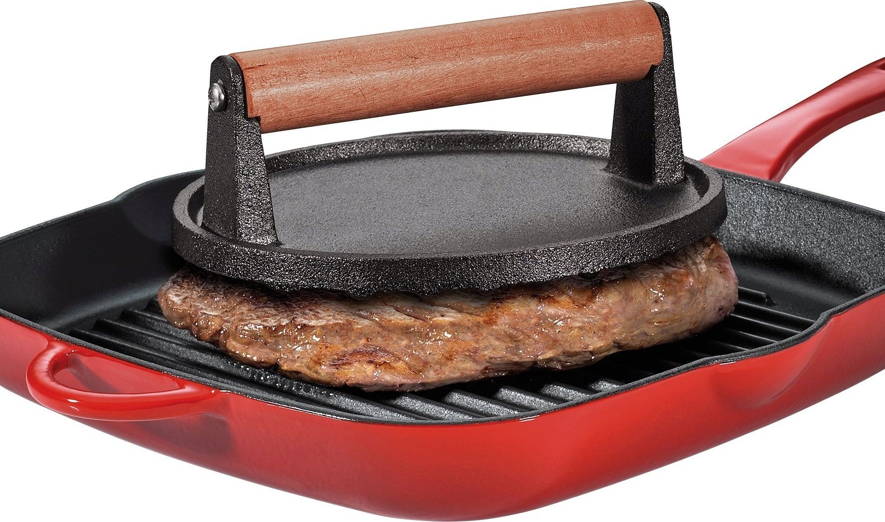 Perfetto per tutti gli appassionati di grill e hamburger. Il pressacarne BBQ garantisce una cottura uniforme e veloce sulla griglia o in padella. Grazie al peso di circa 1,2 kg, anche i filetti XXL vengono dorati in modo omogeneo.