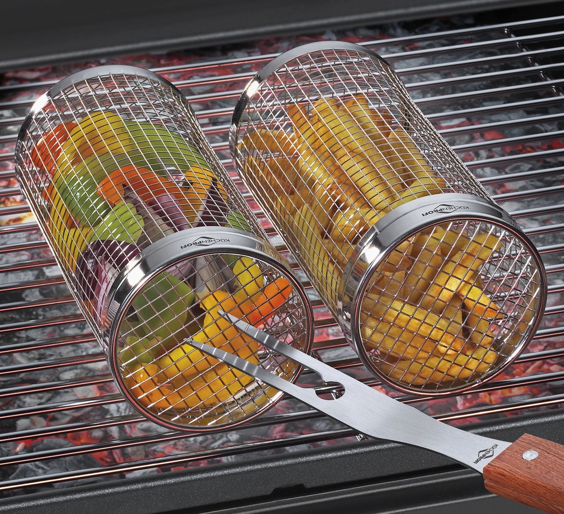 Che si tratti di verdure, gamberi, patatine o polpette, nel pratico cestello per grill RONDO di Küchenprofi anche gli alimenti più piccoli cuociono in modo uniforme senza cadere tra le griglie. Basta girare il cestello e gustare.