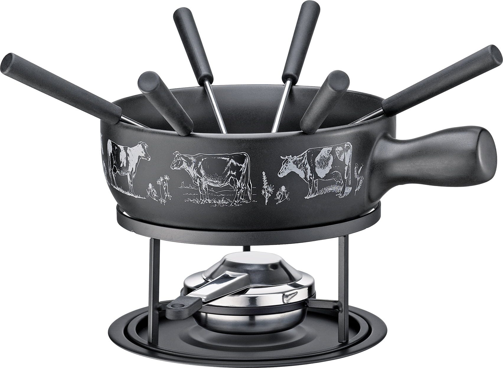 Dotazione: pentola per fonduta, rechaud, base, bruciatore di sicurezza a pasta combustibile, 6 forchette da fonduta