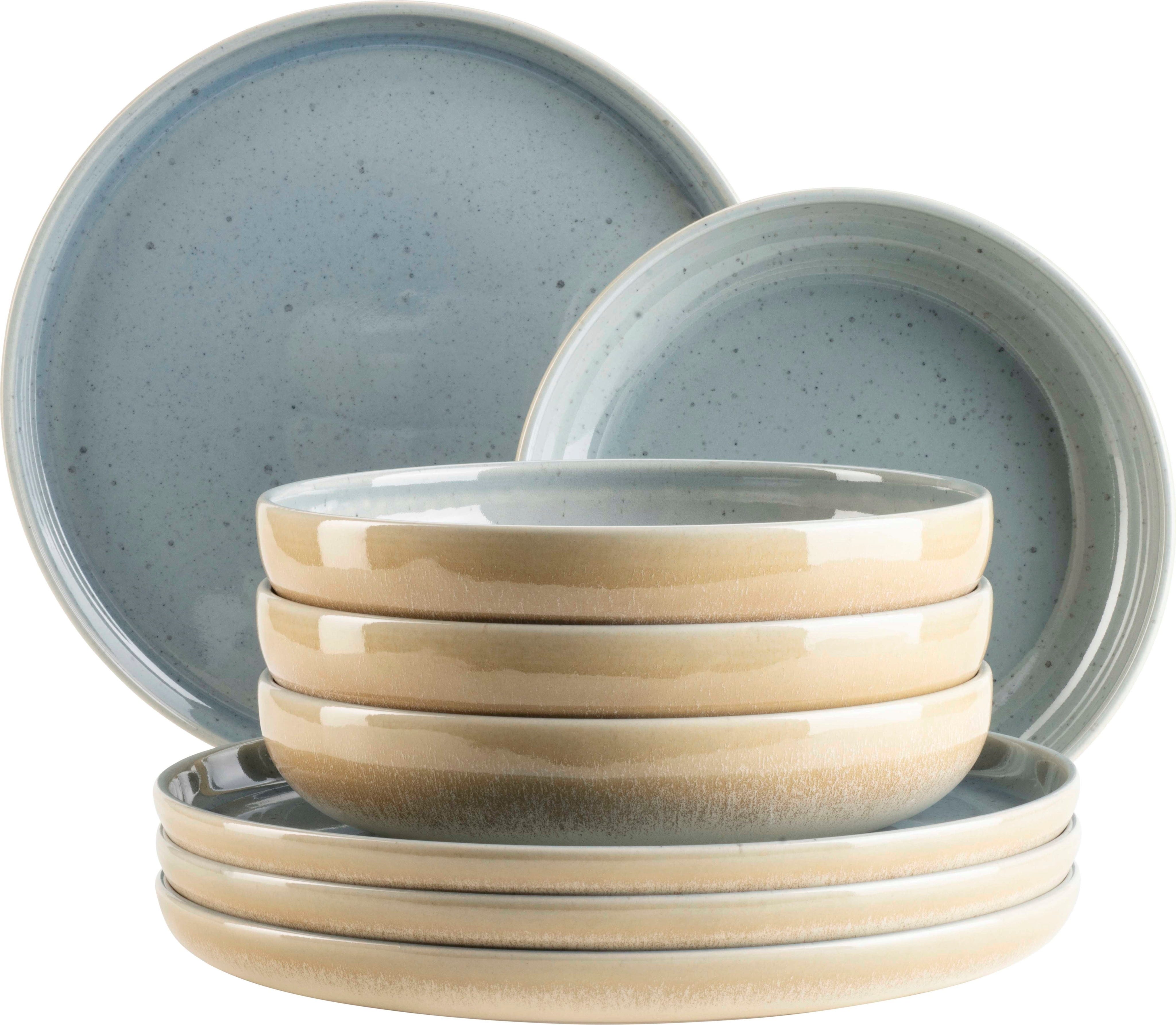 Dona alla tua cena un tocco di leggerezza estiva con questo servizio da tavola da otto pezzi e lasciati conquistare dal fascino moderno della ceramica portoghese! La combinazione di delicato blu pastello e smaltatura reattiva rende ogni piatto un pezzo unico dal vivace gioco di colori.
