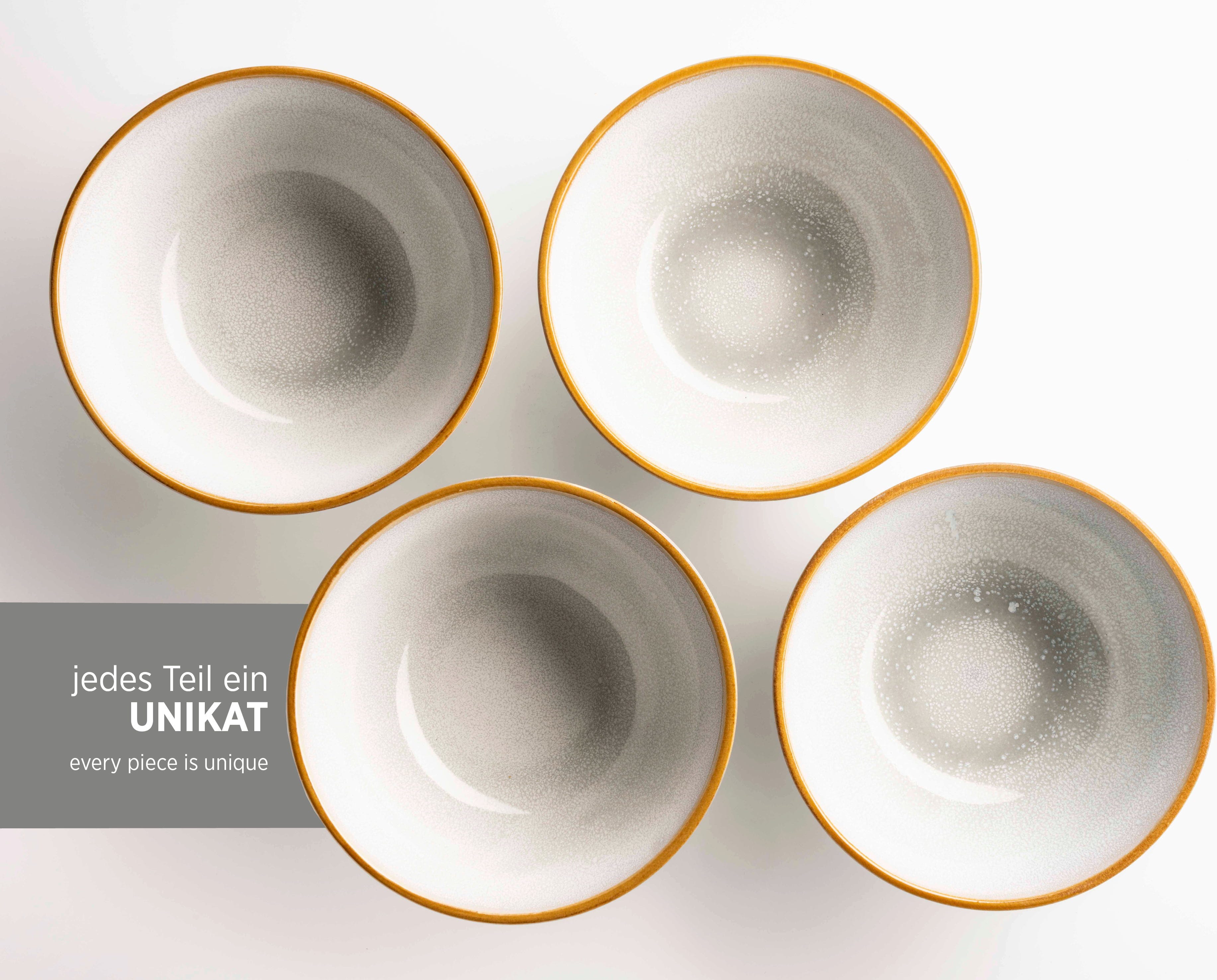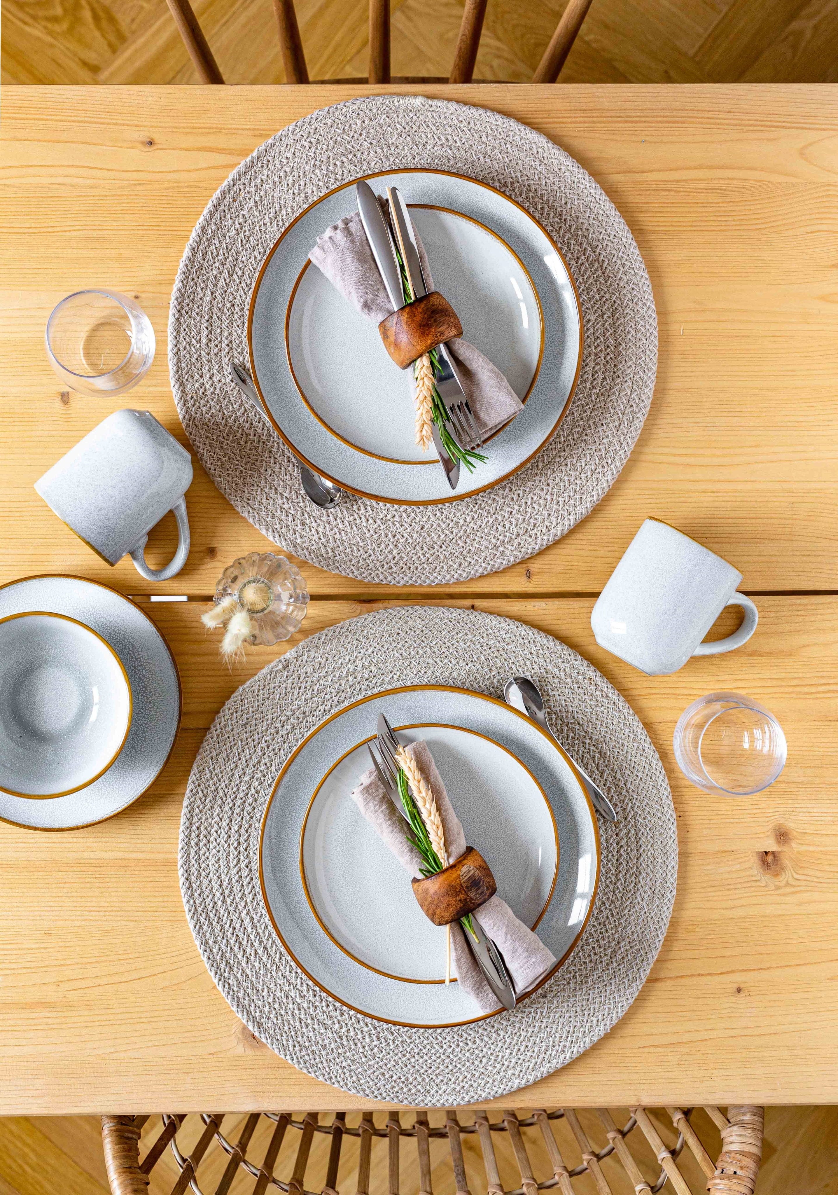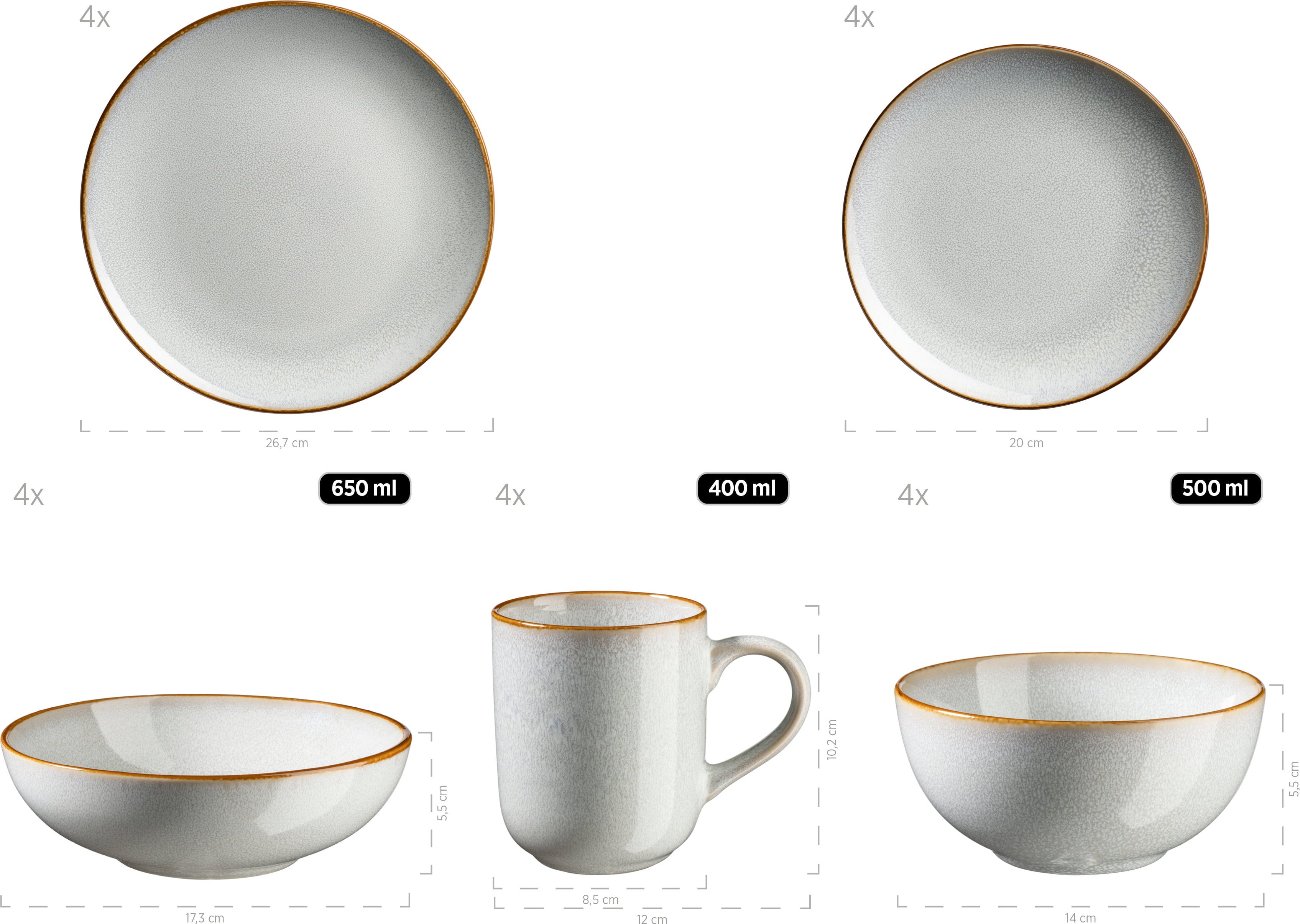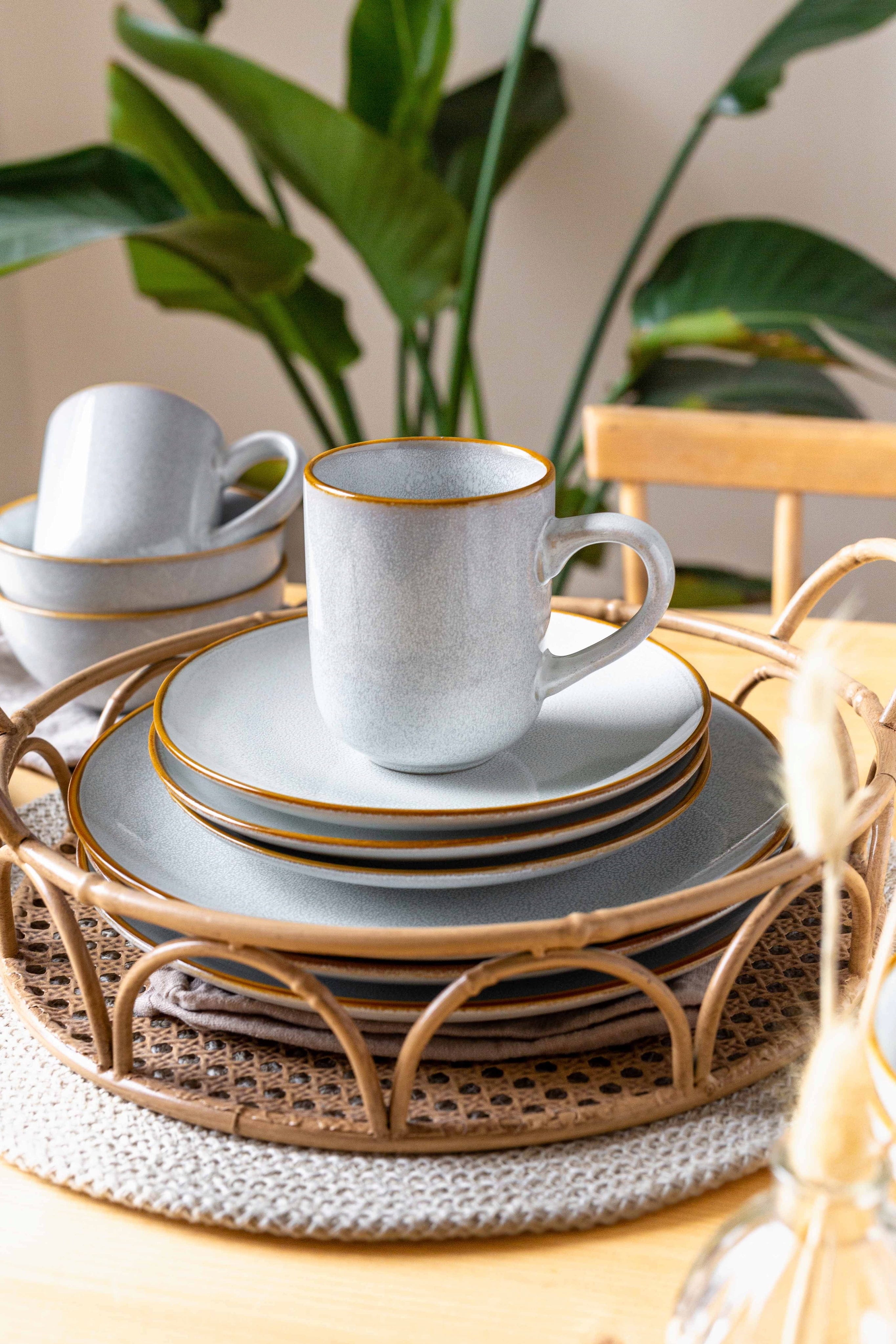 Realizzato in gres resistente dalle forme morbide e arrotondate, questo ricco servizio per 4 persone comprende quattro piatti piani, quattro piatti dessert, quattro ciotole grandi da zuppa, quattro ciotole per cereali e quattro tazze da caffè, offrendoti una dotazione completa per ogni occasione. Perfetto sia per la colazione di tutti i giorni sia per una cena rilassata con gli ospiti, unisce estetica senza tempo e praticità quotidiana grazie alla compatibilità con microonde e lavastoviglie.
