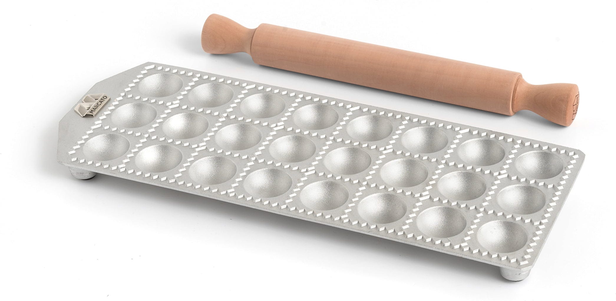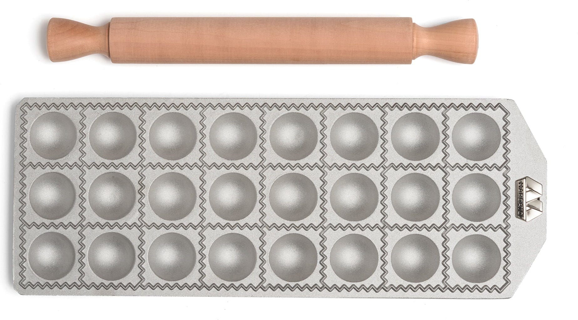 Il fantastico raviolatore del brand Marcato è pensato per coloro che amano la cucina e soprattutto la pasta ripiena. Disponibile in diverse misure, l'accessorio viene consegnato con un pratico mattarello in legno massello. Al passaggio del mattarello sulla sfoglia, il ripieno dei ravioli risulta perfettamente sigillato, di modo che in fase di cottura la farcitura non fuoriesca.