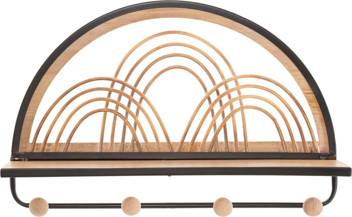 Il mix tra legno caldo e cornice in metallo nero crea un contrasto elegante che valorizza subito l'ambiente. Con un pratico ripiano e quattro ganci robusti con pomelli in legno, Oporto offre lo spazio ideale per chiavi, accessori e giacche. Un vero highlight di design che unisce estetica e funzionalità con stile.