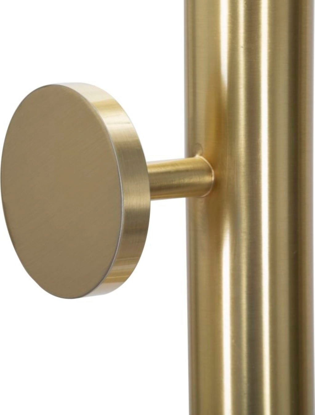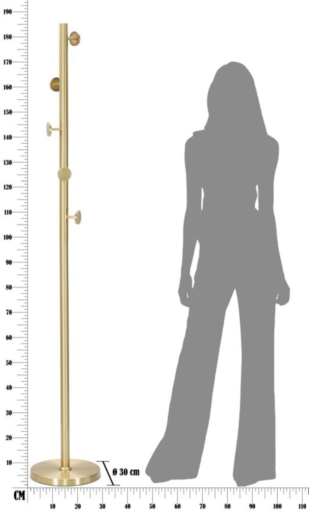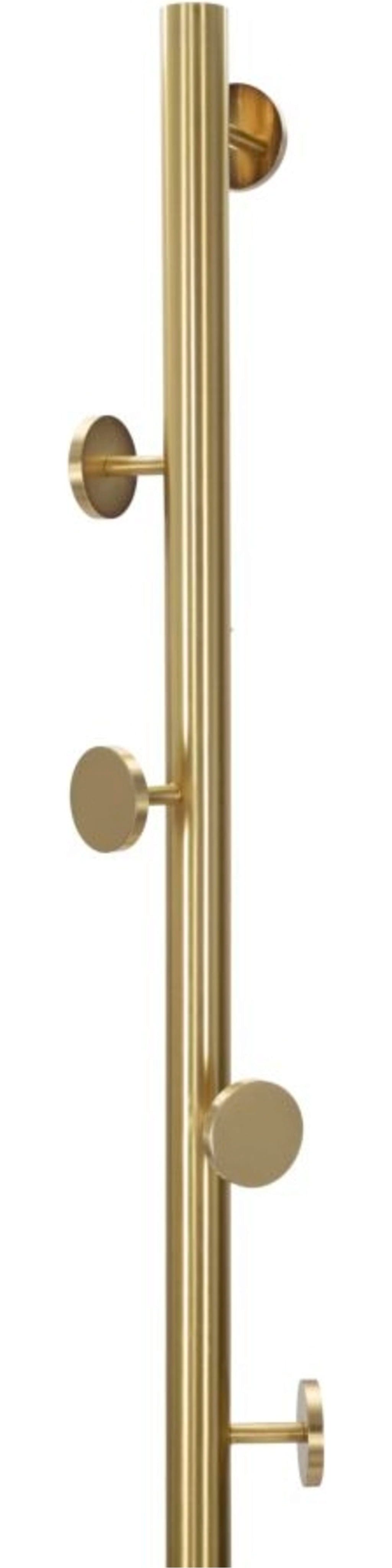 La colonna slanciata, con finitura oro brillante, colpisce per le linee pulite ed essenziali, capaci di rendere subito più esclusivo qualsiasi ambiente. I cinque pomelli rotondi, disposti in modo sfalsato, offrono spazio per cappotti, borse e accessori senza appesantire visivamente. La base circolare e solida garantisce stabilità e completa l'insieme con un tocco impeccabile.
