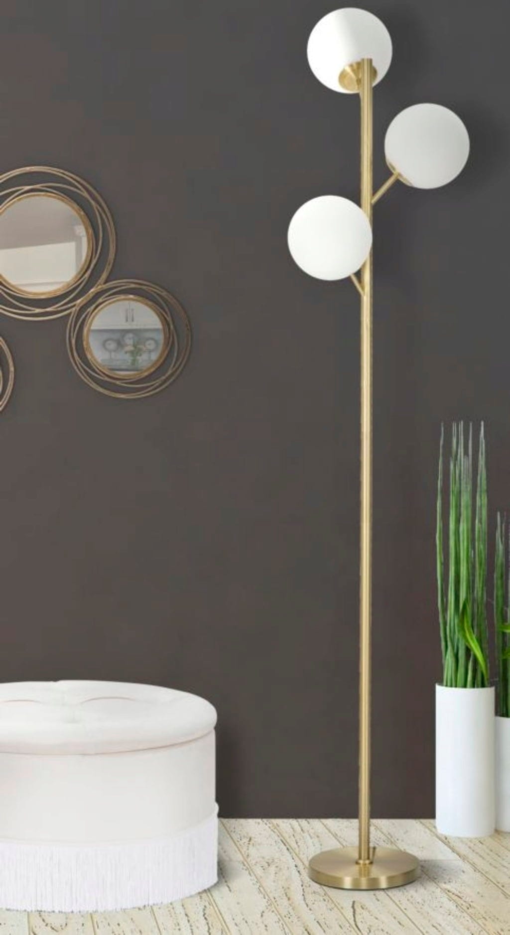 Illumina il tuo living con un tocco brillante grazie alla lampada da terra Glamy di Mauro Ferretti. Questa lampada a tre luci in metallo color oro unisce linee minimaliste ed eleganza lussuosa in un oggetto di design unico.