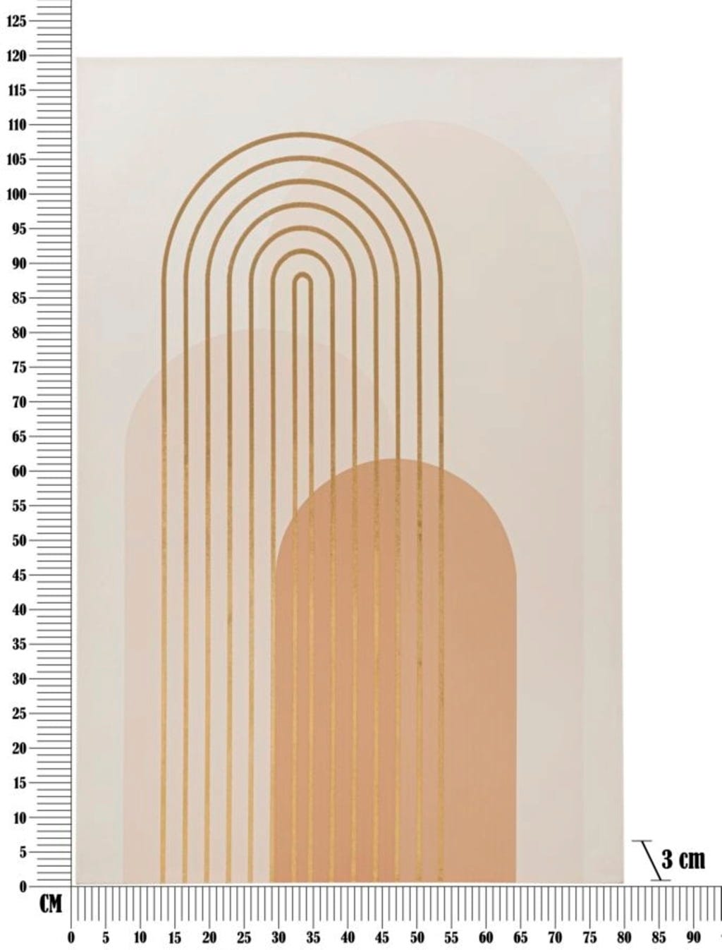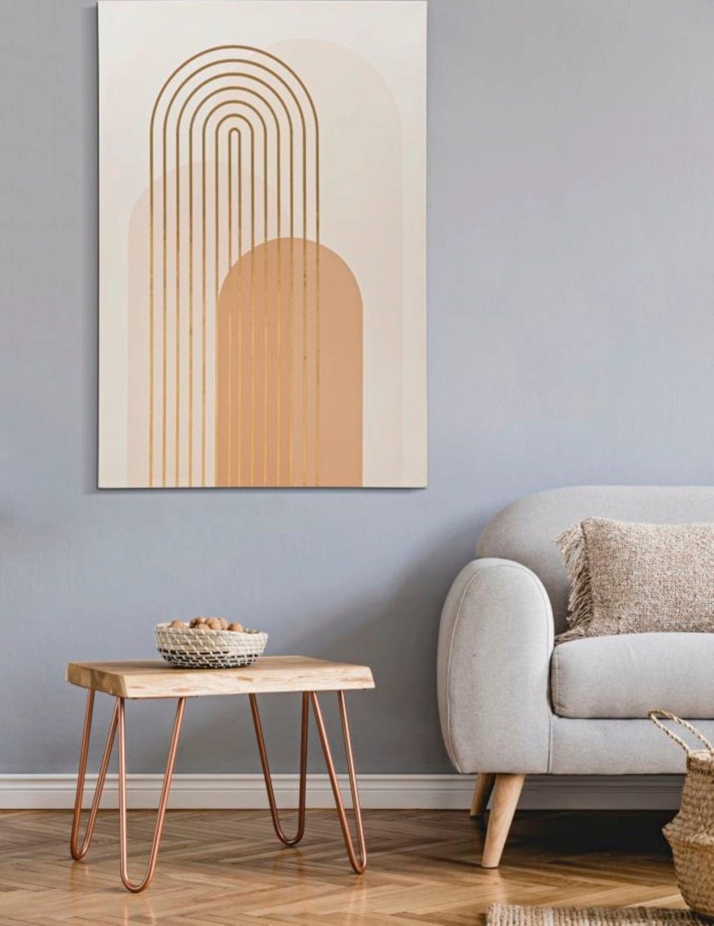 Il motivo gioca con forme ad arco morbide, sovrapposte in sequenza in diverse sfumature di beige, sabbia e terracotta calda. Sottili linee dorate attraversano la composizione come raggi di sole, aggiungendo una profondità elegante e strutturata. Teso su un solido telaio in legno, Shine -A- è la scelta ideale per un interior che punta su eleganza discreta e tonalità armoniose.