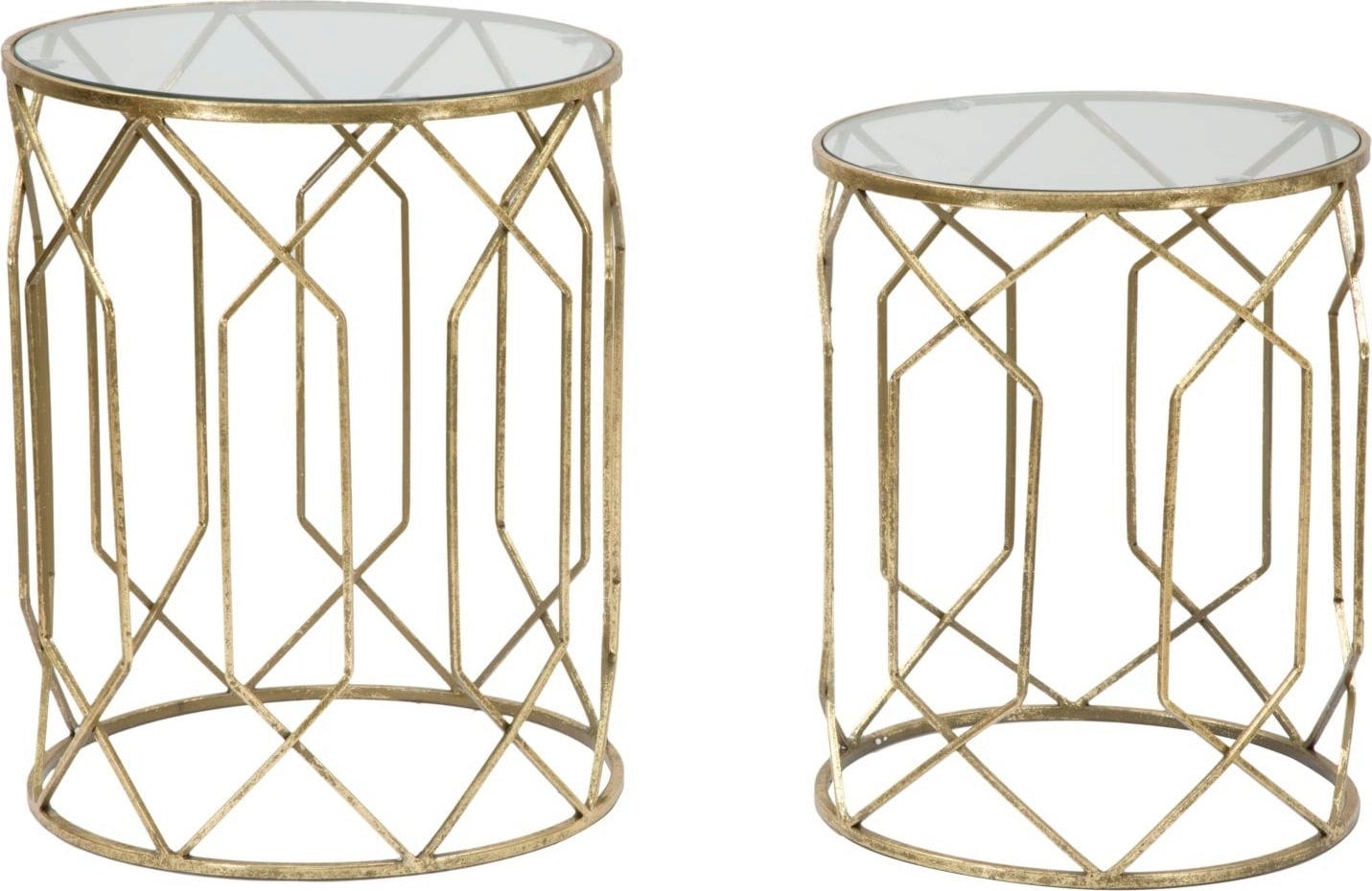 Vivi l’effetto scenografico della combinazione tra oro e vetro con questi tavolini laterali dal fascino lussuoso e glamour, proposti in un pratico set da 2. Il set è ideale per valorizzare con stile i tuoi oggetti preferiti. La struttura in metallo color oro colpisce per il suo design geometrico, che crea un elegante effetto di leggerezza e slancio.