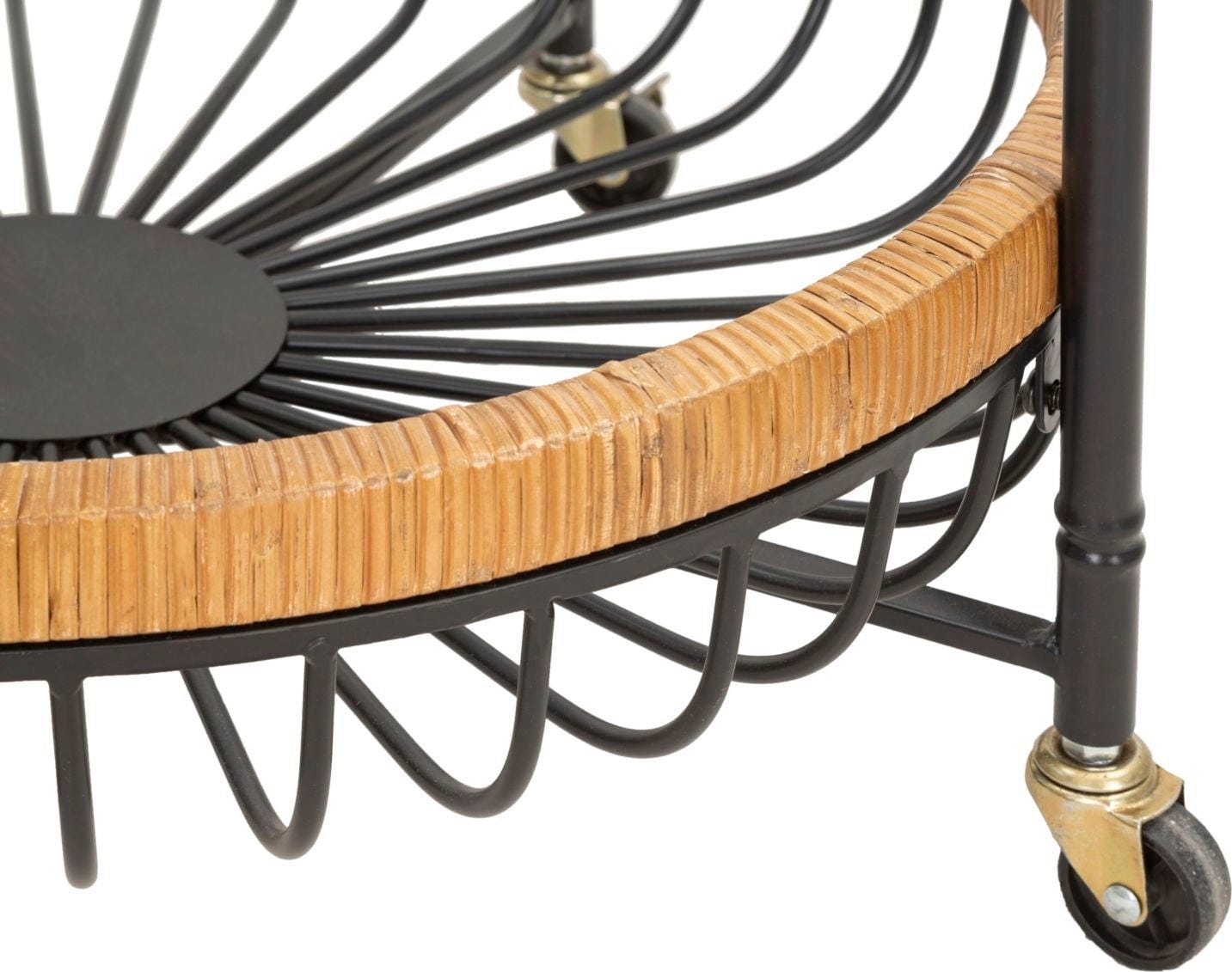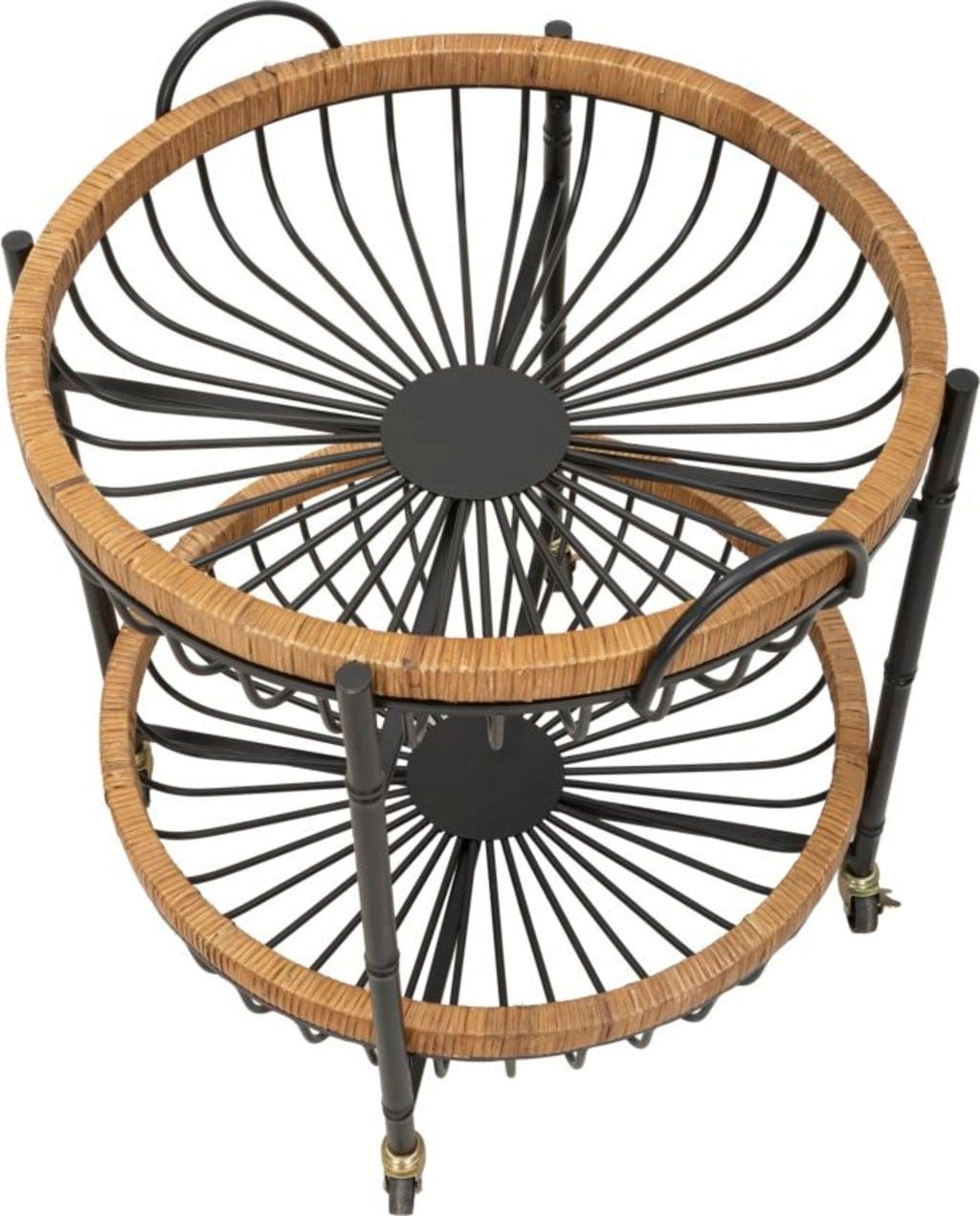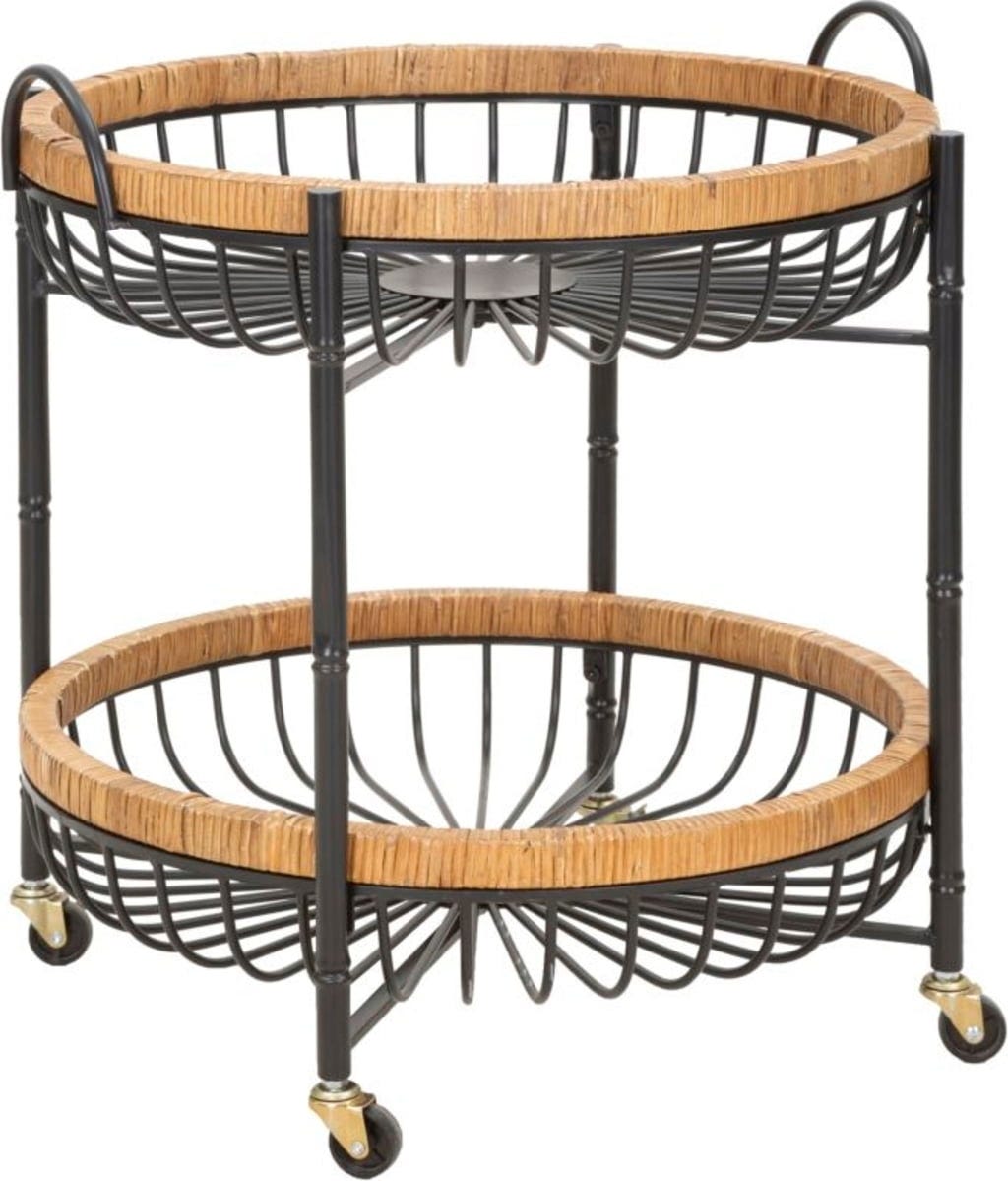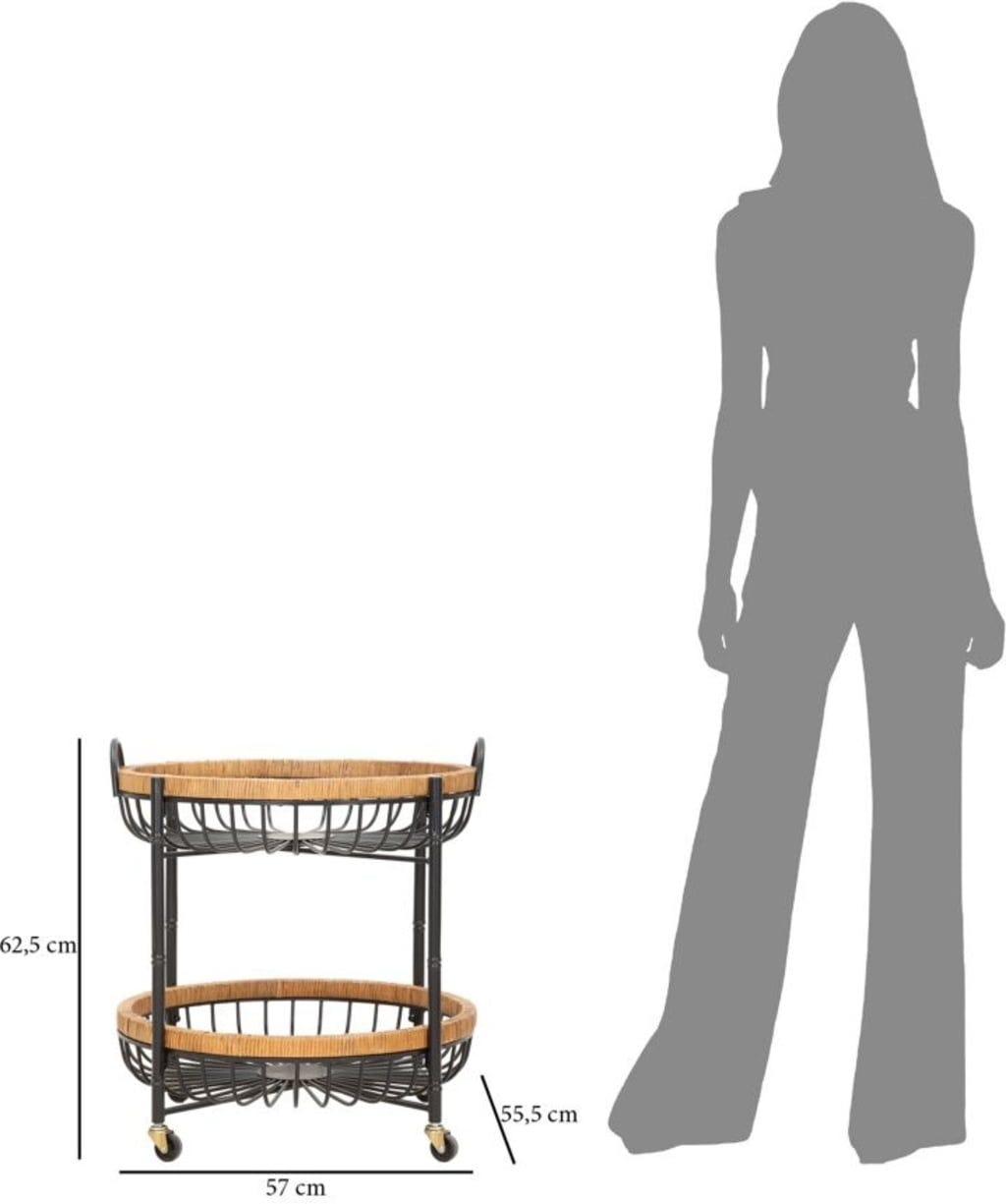 La struttura in metallo nero sostiene due ampi cestelli con sottili bacchette metalliche, incorniciati da un caldo bordo in rattan. Grazie alle quattro pratiche ruote e alle maniglie integrate, Cebu si sposta facilmente e può essere utilizzato come carrello bar, tavolino d'appoggio o portapiante decorativo.