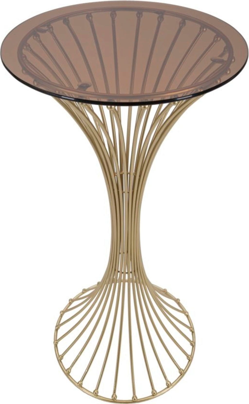 La struttura è composta da numerose aste verticali che si restringono elegantemente al centro e terminano con piccole sfere decorative lucide. Il piano in vetro fumé di alta qualità dona profondità e un'eleganza contemporanea, valorizzando il caldo finish dorato. Perfetto come elemento d'accento ricercato.