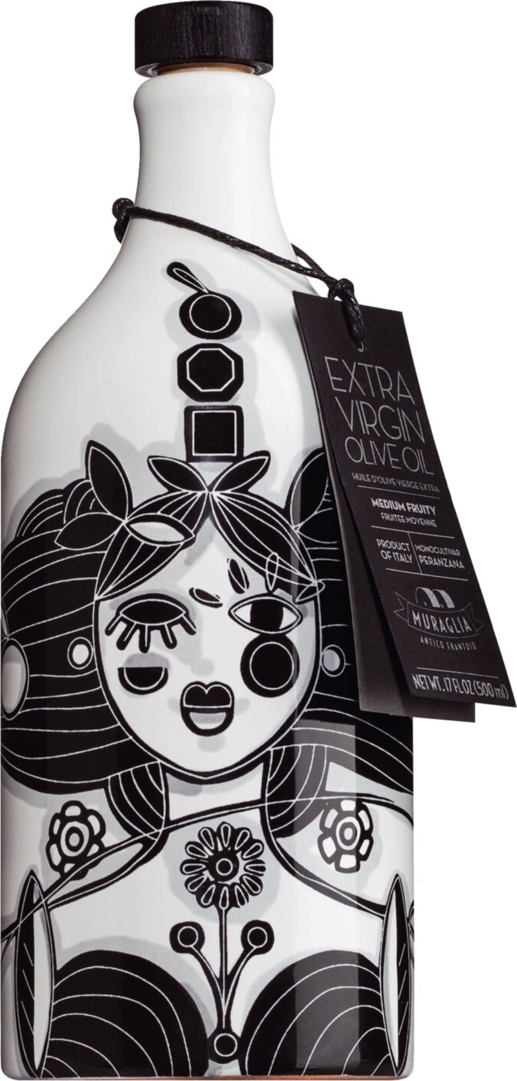 L'olio pugliese da olive Peranzana spremute a freddo ha un sapore medio-fruttato ed è perfetto per condire carni, fritture di pesce, insalate o antipasti. Le olive vengono raccolte a mano da Muraglia e spremute in un antico frantoio in pietra. Successivamente, l'olio viene versato in bottiglie di argilla lavorate a mano.
