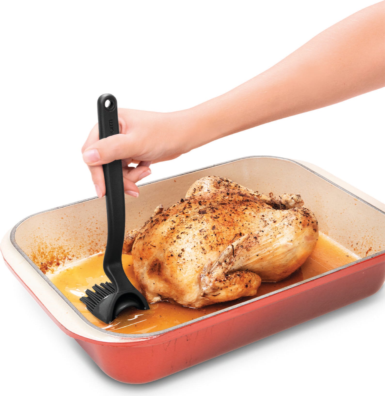 All'interno della testa quattro aperture regolano il rilascio uniforme del liquido, mentre 100 sottilissime setole in silicone garantiscono un risultato pulito e uniforme. Il pennello resiste al calore fino a 260 °C, rimane igienico e può essere facilmente lavato in lavastoviglie dopo l'uso.