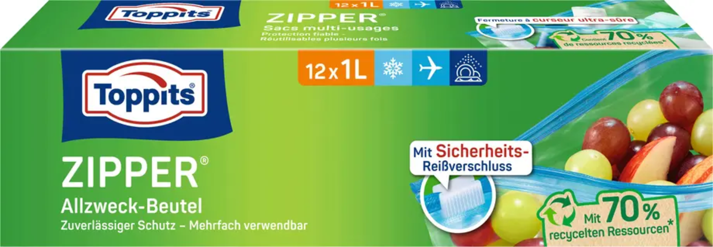 I sacchetti multiuso Zipper® di Toppits sono pratici sacchetti richiudibili, ideali per conservare in modo ordinato gli alimenti, congelare, trasportare o riporre cibi e piccoli oggetti. Grazie alla chiusura di sicurezza integrata con zip, si richiudono in modo semplice, ermetico e affidabile.